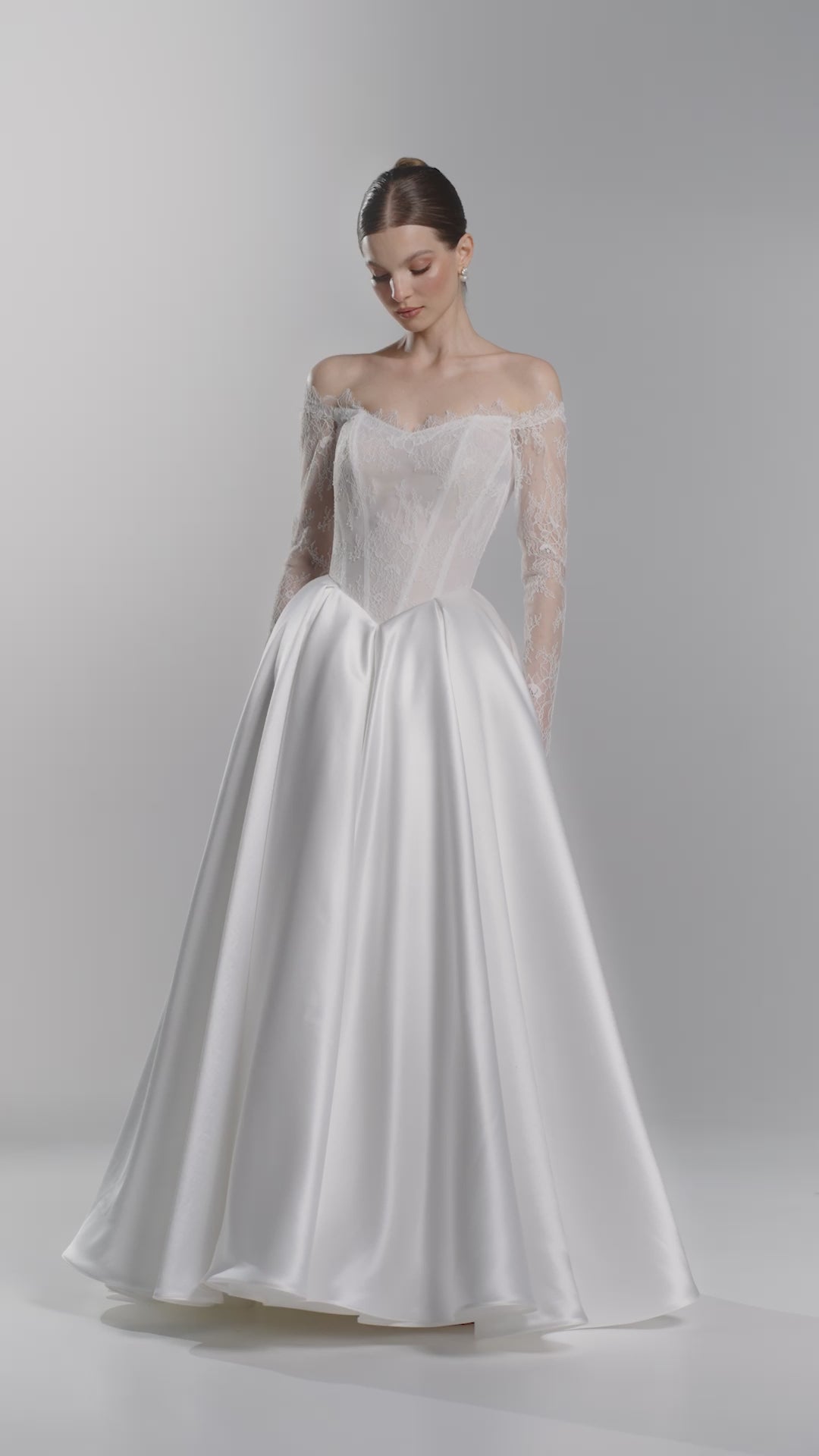 Kreacja ślubna Adore — to połączenie tradycyjnej i nowoczesnej mody ślubnej. Ta oszałamiająca sukienka wykonana jest ze szlachetnej satyny i delikatnej koronki Chantilly. Dopasowana góra z dekoltem w kształcie serca podkreślona subtelnymi koronkowymi rękawami. Księżniczkowa spódnica o długości maxi może być dopełniona wyjmowaną halka tiulowa dla dodatkowej objętości.