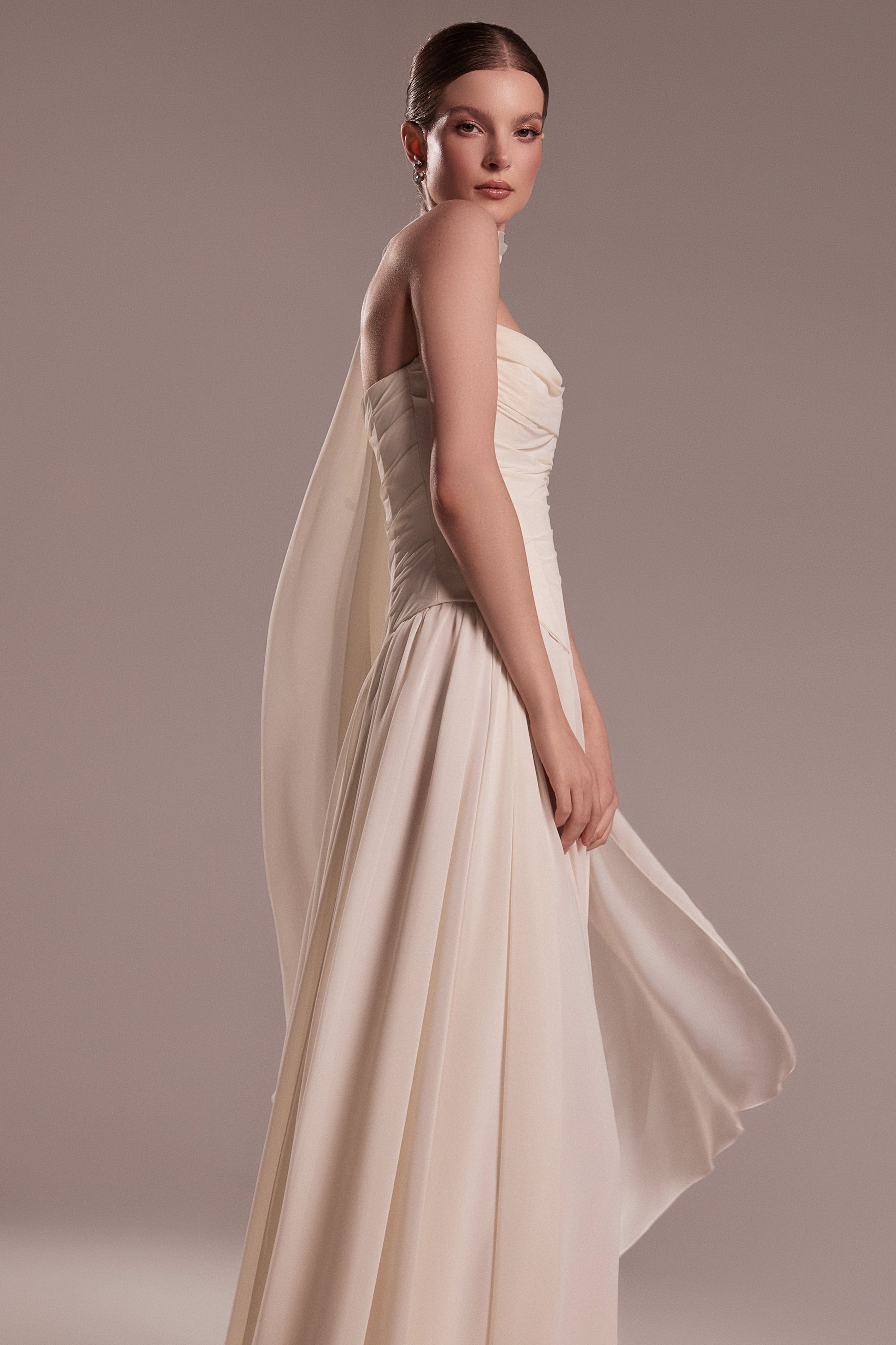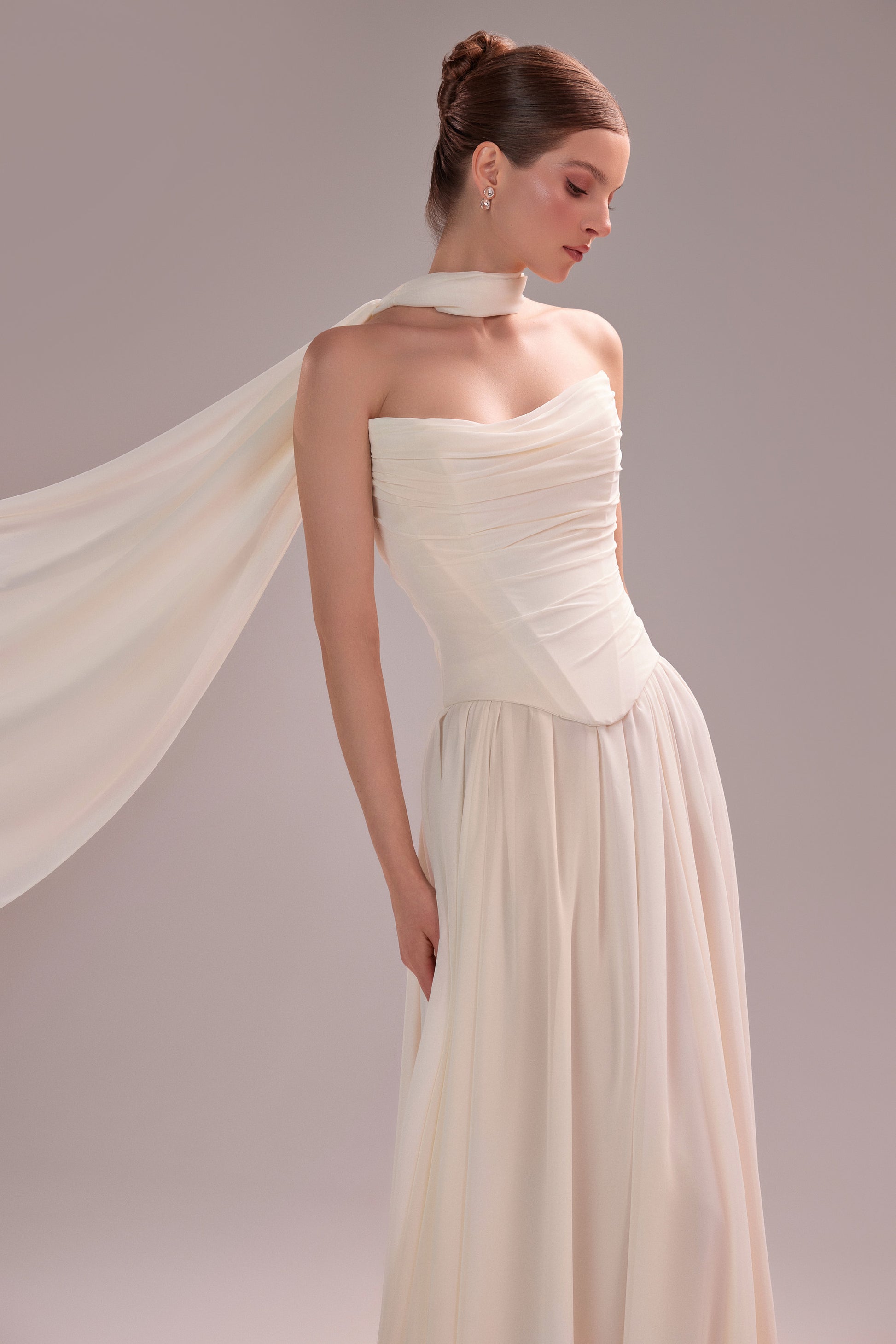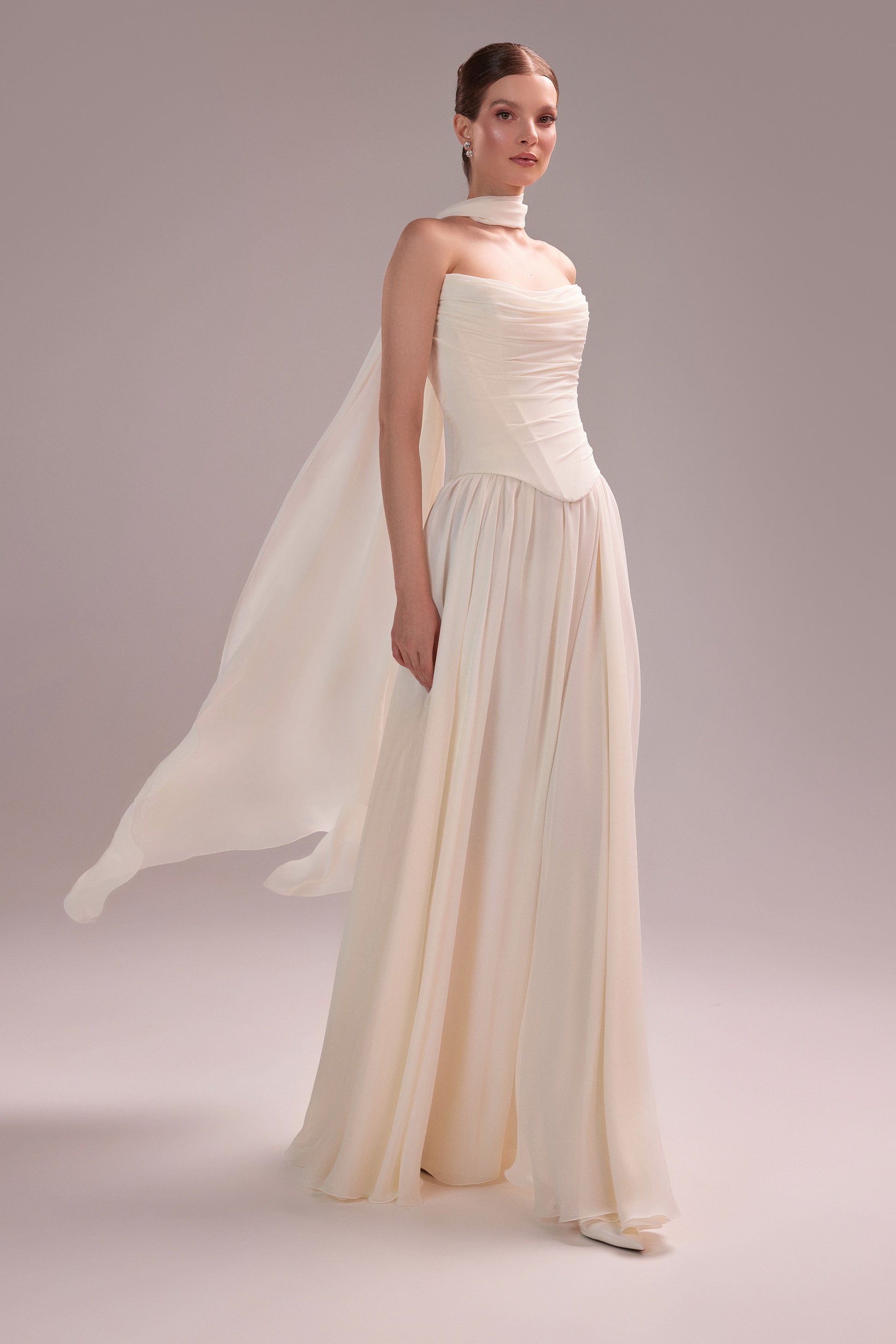Suknia Dariana stworzona dla Panien Młodych ceniących klasyczną formę i kobiecą estetykę, która pozostaje w pamięci na długo. Zwiewny, delikatnie układający się szyfon nadaje sylwetce subtelności, jednocześnie podkreślając uroczystość ceremonii. Miękko drapowany gorset estetycznie modeluje talię i biust. Spódnica w kształcie litery "A" pięknie układa się w ruchu, zapewniając komfort i lekkość. Kreację dopełnia szyfonowy szalik, który można swobodnie zarzucić na ramiona lub finezyjnie ułożyć wokół szyi, dodając całości indywidualnego wyrazu.