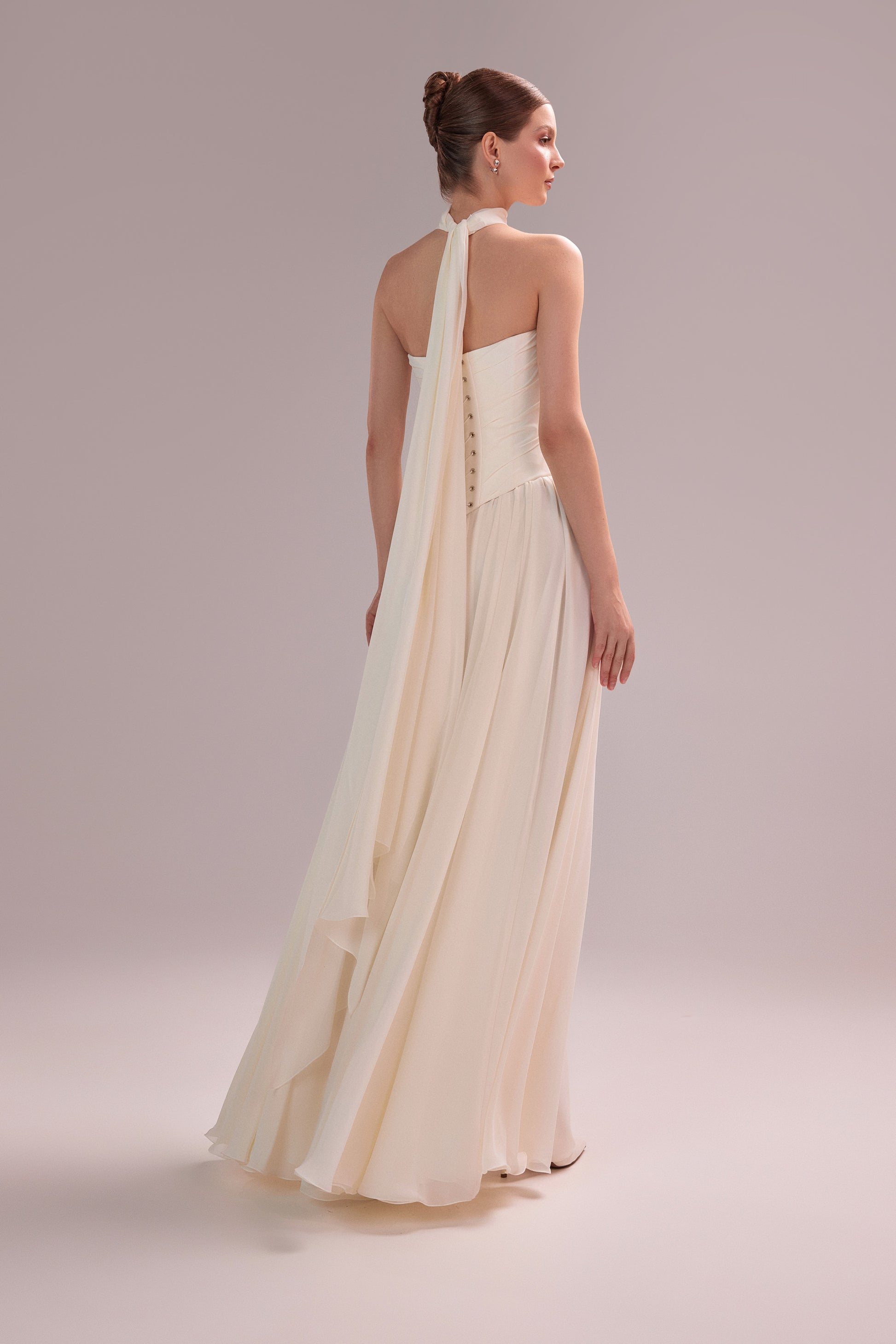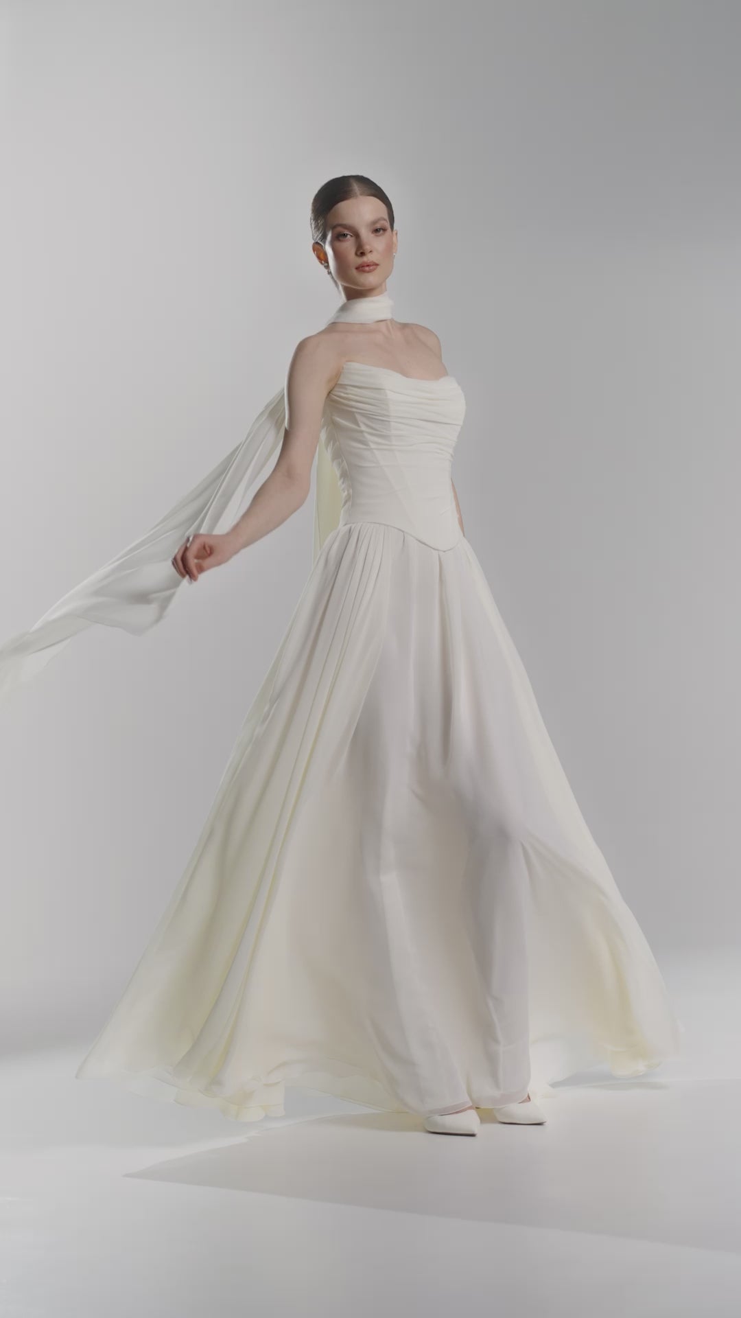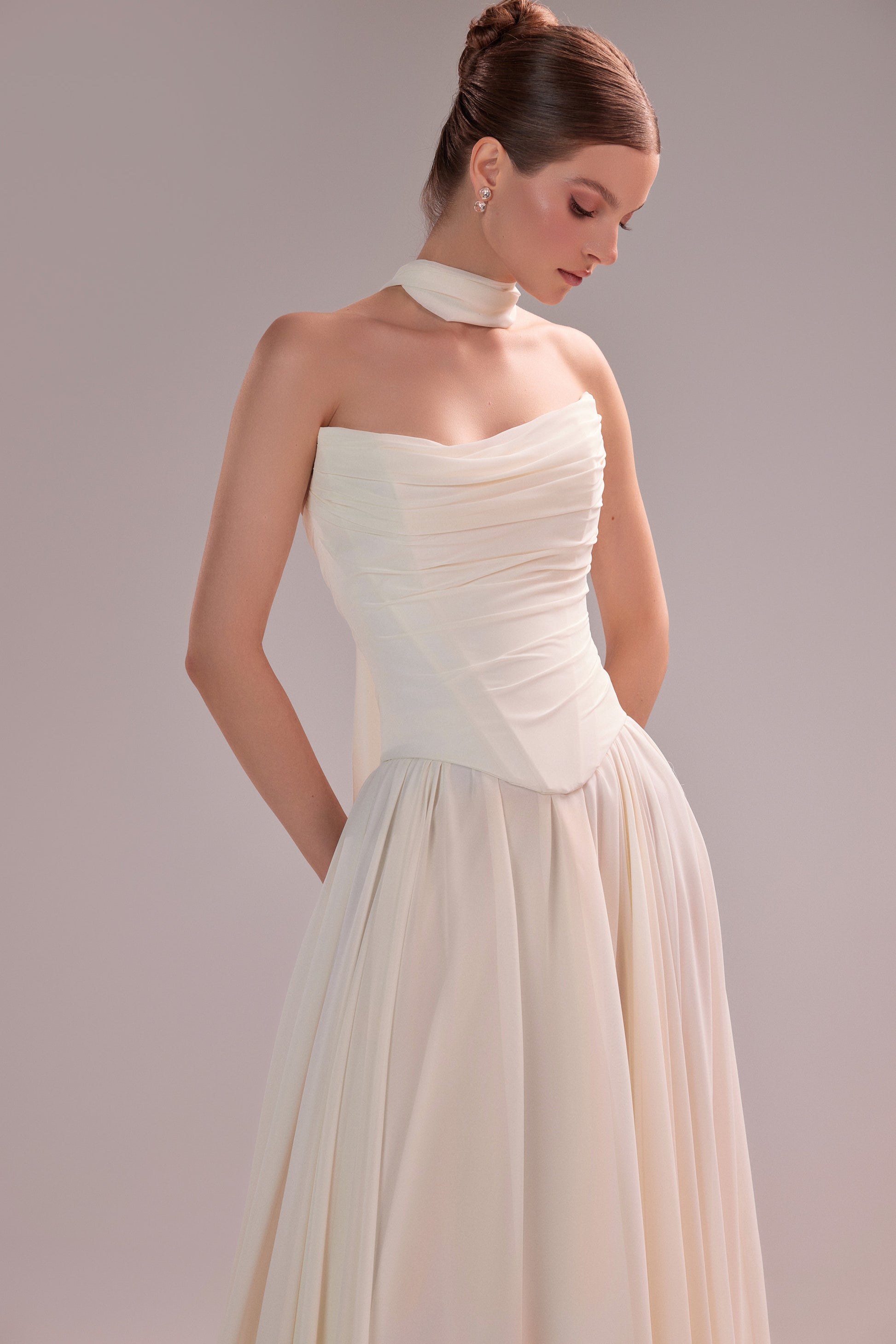 Suknia Dariana stworzona dla Panien Młodych ceniących klasyczną formę i kobiecą estetykę, która pozostaje w pamięci na długo. Zwiewny, delikatnie układający się szyfon nadaje sylwetce subtelności, jednocześnie podkreślając uroczystość ceremonii. Miękko drapowany gorset estetycznie modeluje talię i biust. Spódnica w kształcie litery "A" pięknie układa się w ruchu, zapewniając komfort i lekkość. Kreację dopełnia szyfonowy szalik, który można swobodnie zarzucić na ramiona lub finezyjnie ułożyć wokół szyi, dodając całości indywidualnego wyrazu.