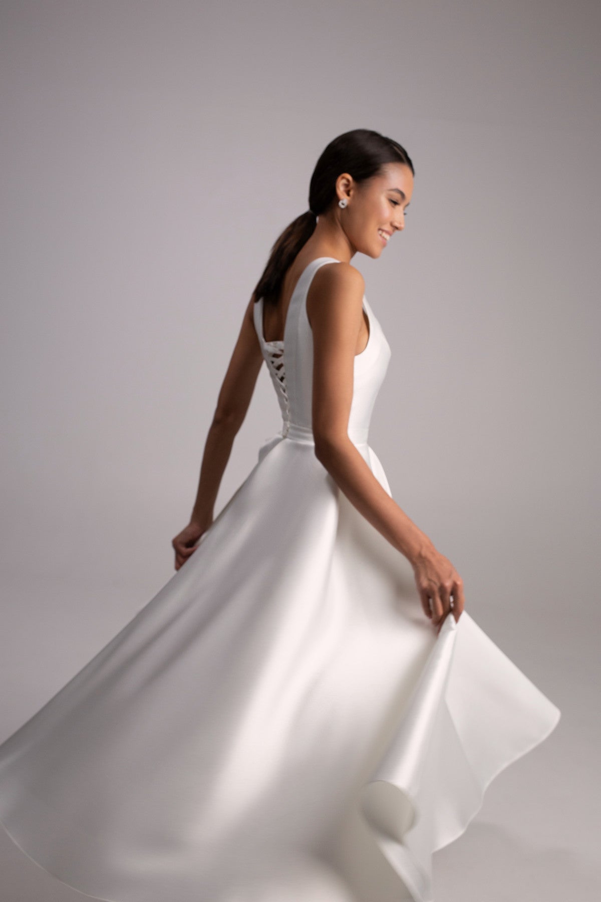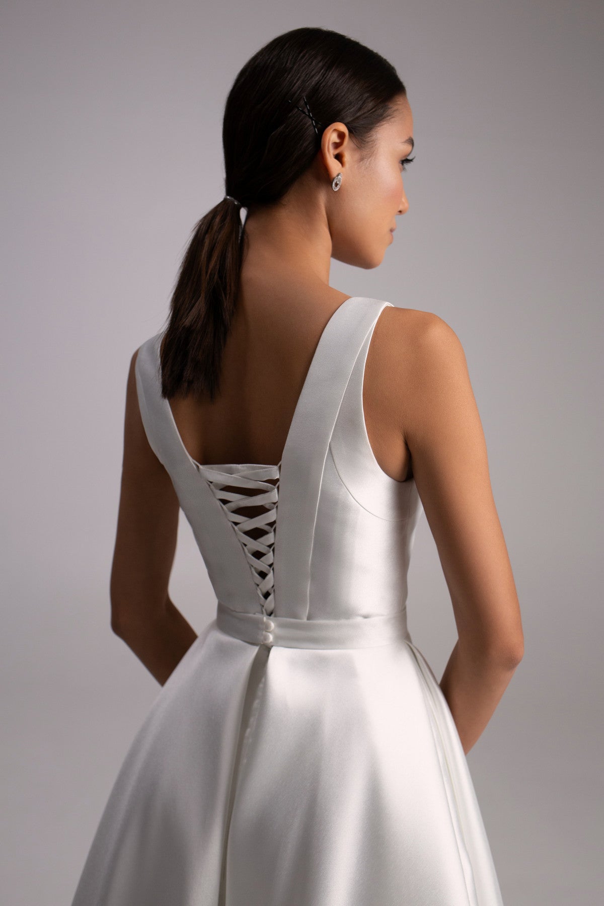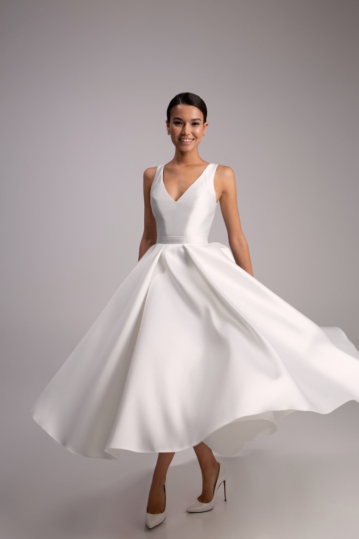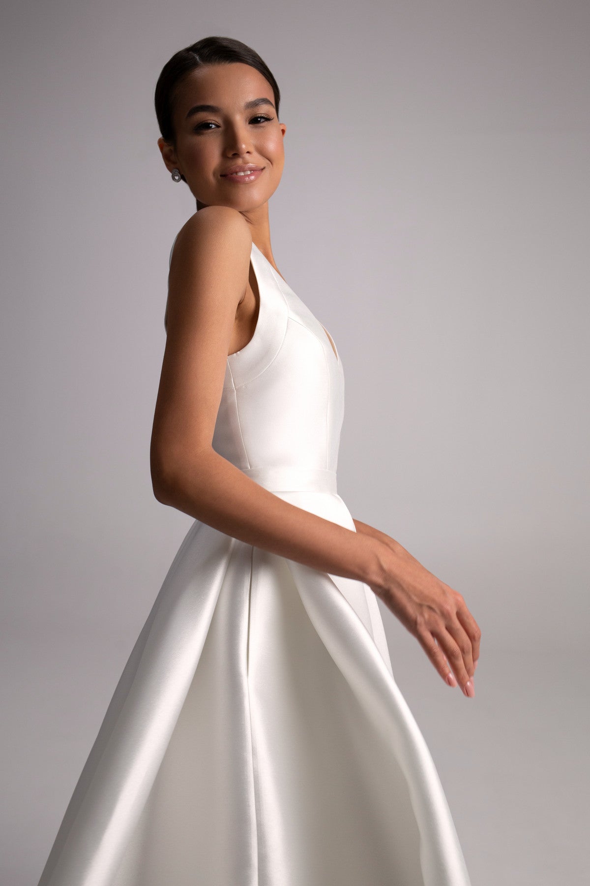 Sukienka Gloria wykonana jest z ciężkiego, teksturowanego materiału Mikado, który zachwyca perłowym połyskiem. Lakoniczny krój spódnicy midi w kształcie litery A, łącząc z górą, ozdobioną głębokim dekoltem w "V", tworzy elegancką kreację, idealną do przyjęcia lub ślubu cywilnego.