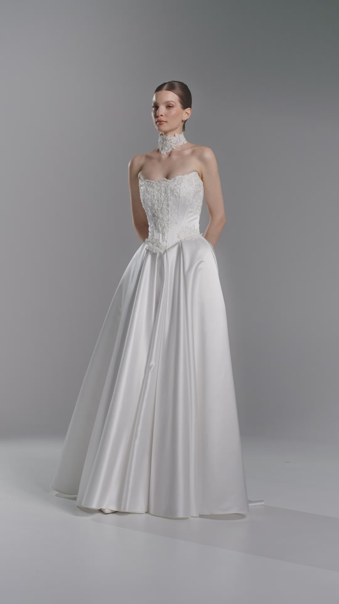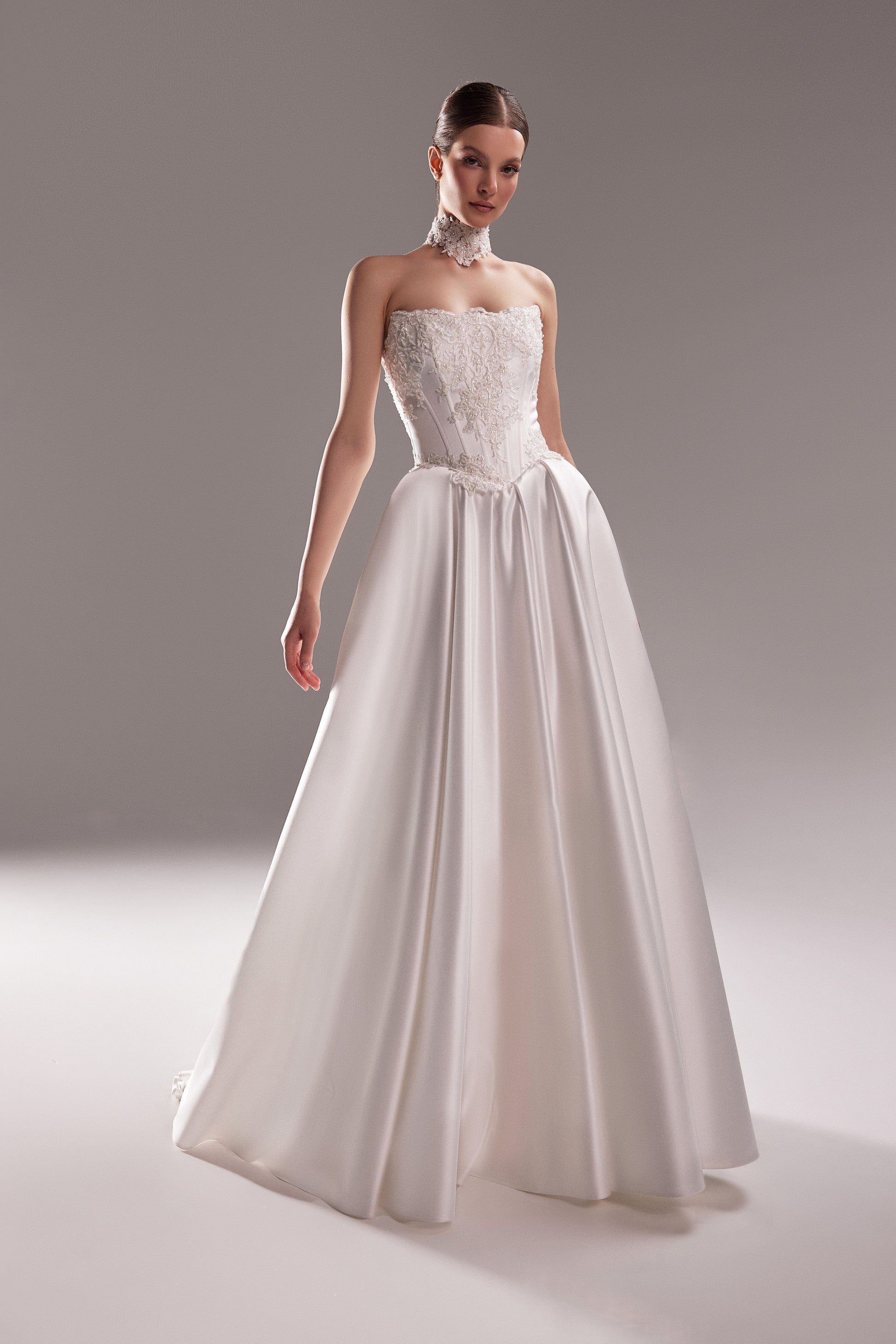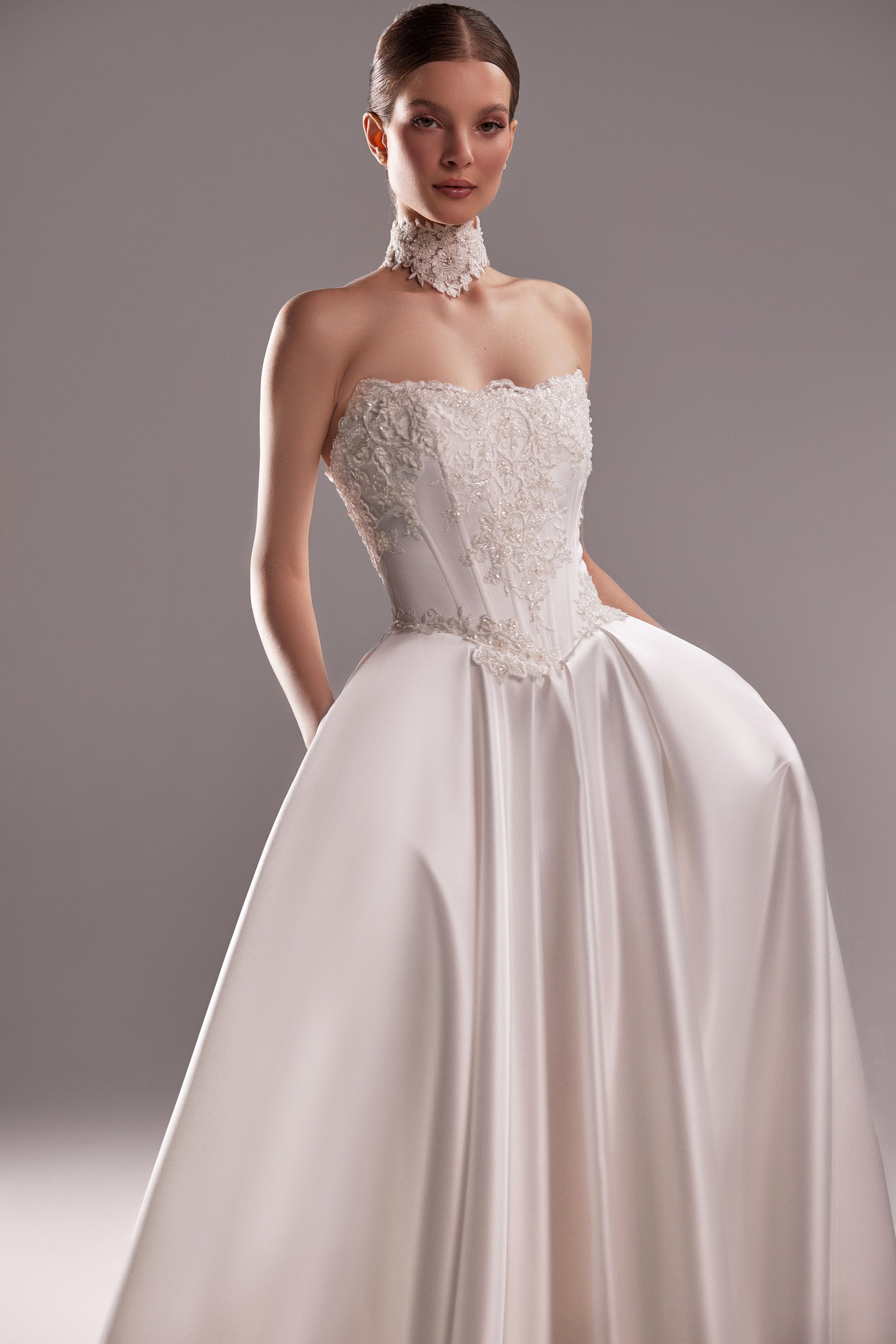 Suknia ślubna Judi stworzona z myślą o wyjątkowych chwilach Panny Młodej, która pragnie zachwycać, wzruszać i na zawsze zapisać się w pamięci. Zdobiony haftem gorset nie tylko subtelnie podkreśla talię ale przyciąga spojrzenia od pierwszego momentu. Lekko rozkloszowana spódnica w kształcie litery "A" miękko opływa sylwetkę, tworząc bajkowy efekt przy każdym kroku. Szlachetny połysk materiału dodaje kreacji klasy i sprawia że w dniu ślubu poczujesz się absolutnie wyjątkowo.