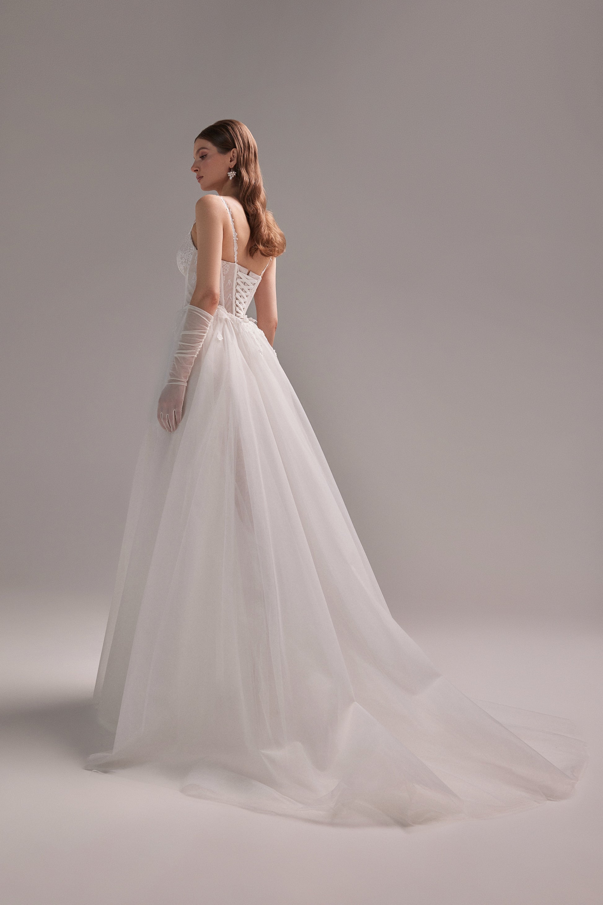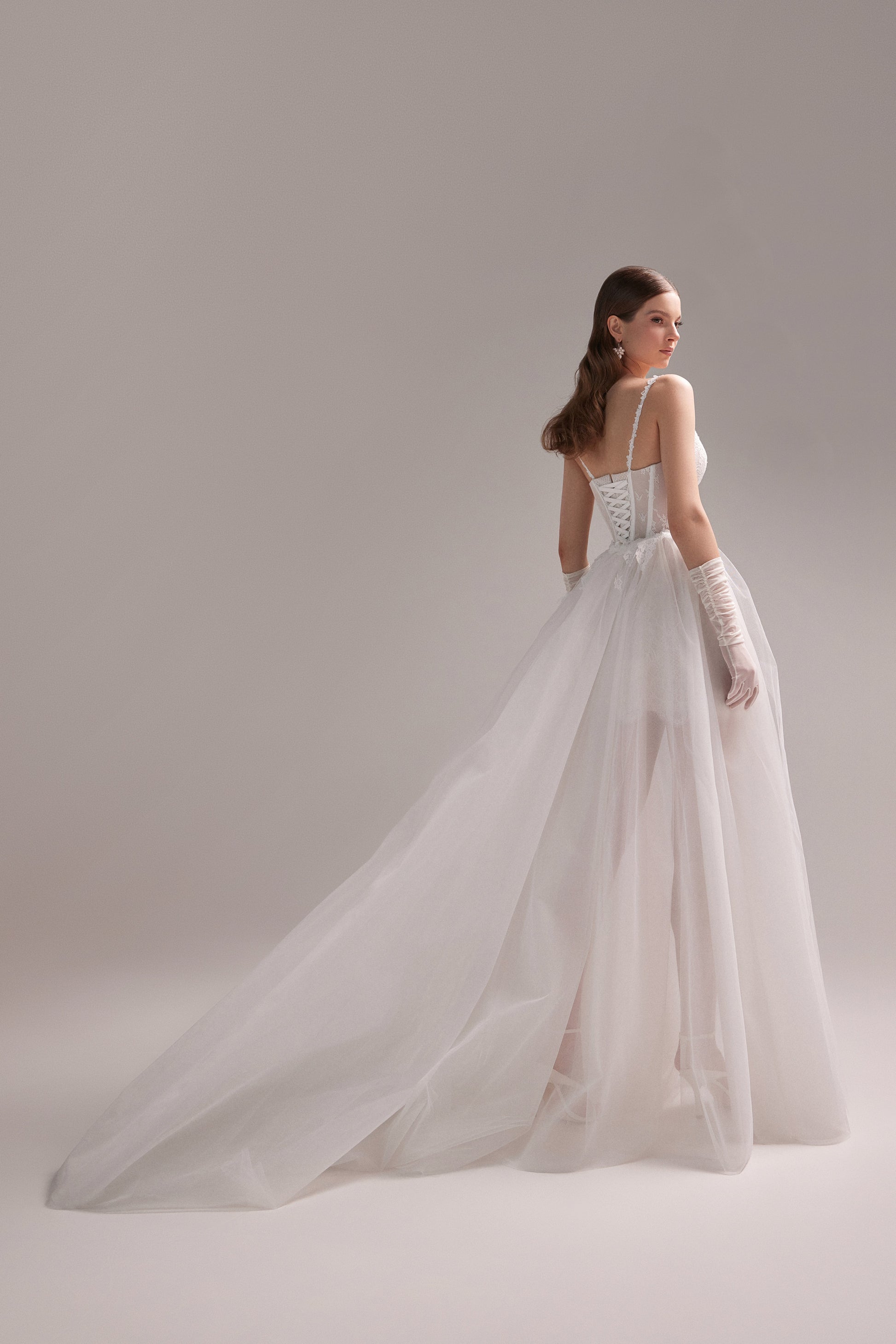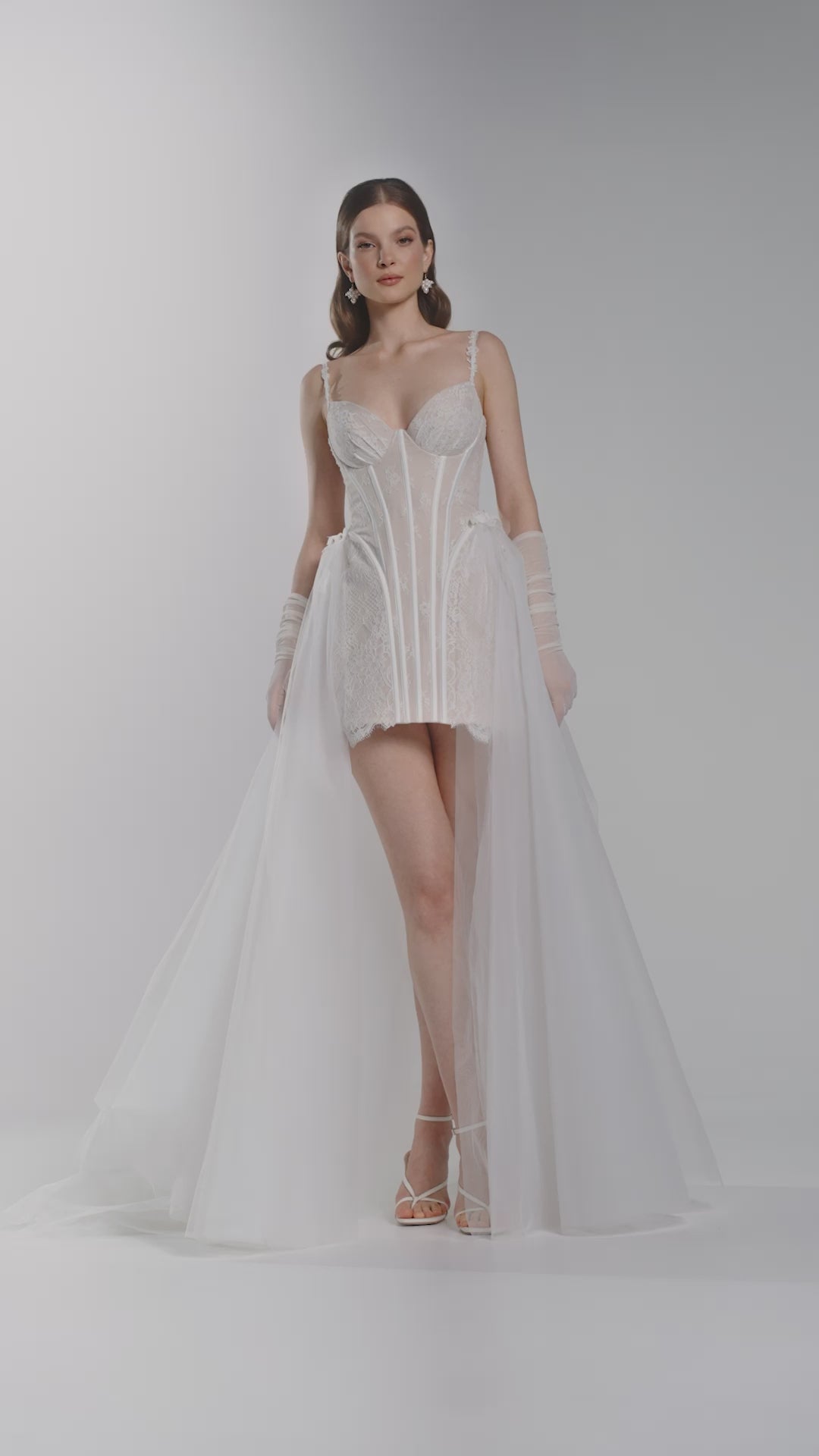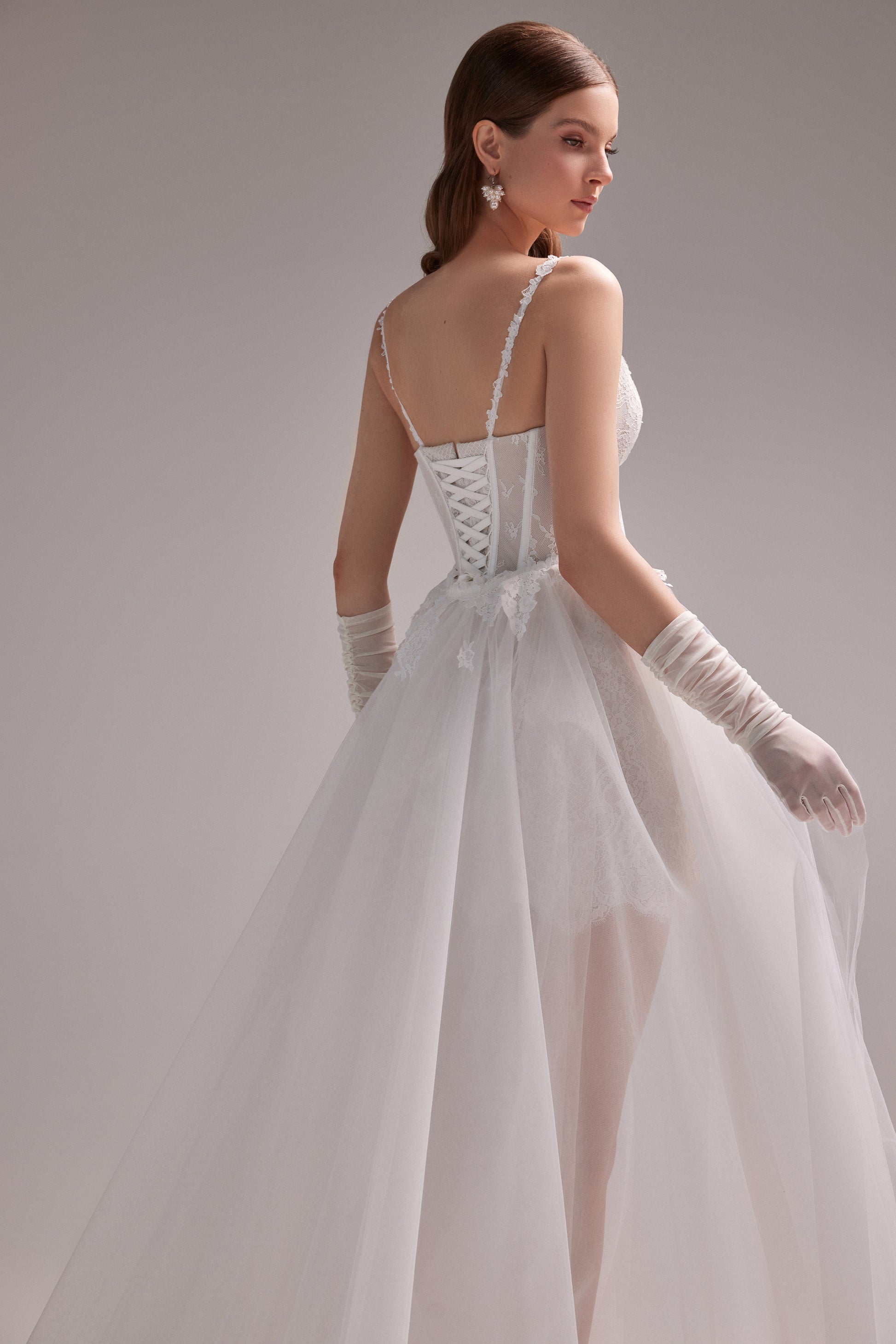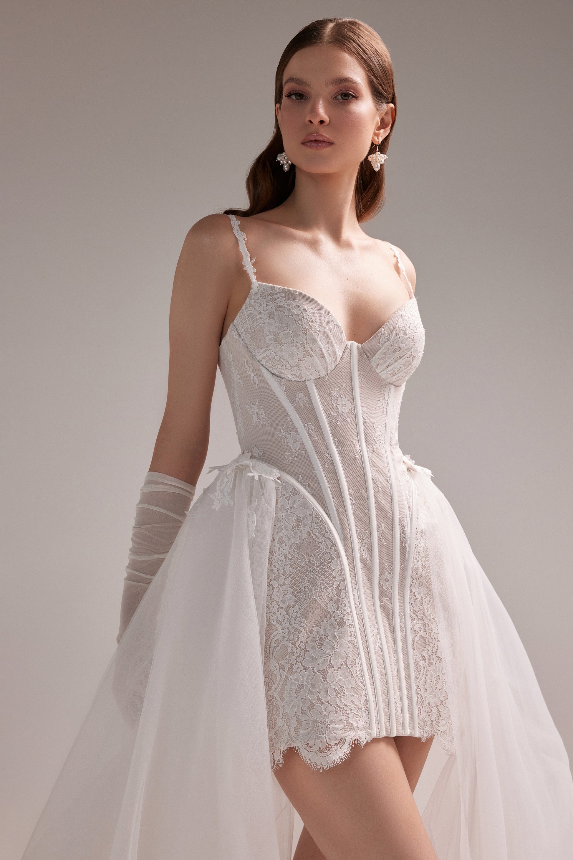 Oszałamiająca koronkowa sukienka ślubna mini z gorsetem na ciężkich ramiączkach i dopinanym trenem. Wycięcie w kształcie serca podkreśla ramiona i dekolt, a krótka spódnica sprawia, że idealnie nadaje się na wiosenny lub letni ślub. Delikatna koronka trwale trzyma formę dzięki usztywniającym fiszbinom. Muse-1 — to idealna sukienka dla Panny Młodej, która chce wyglądać czarująco i nowocześnie.