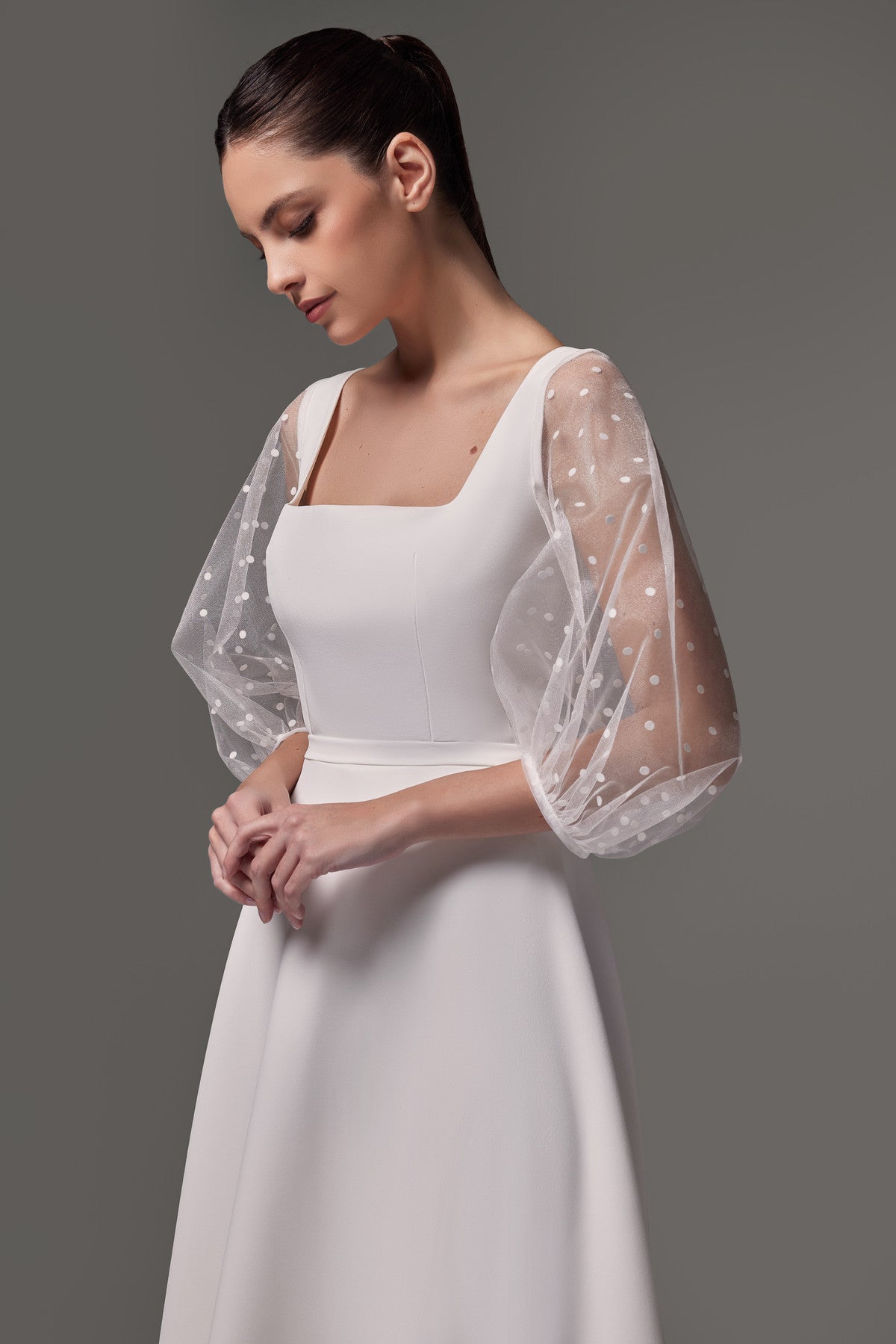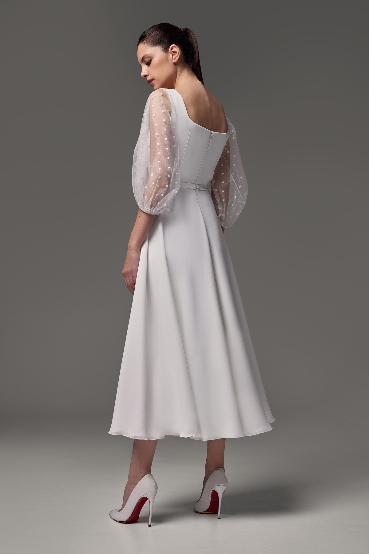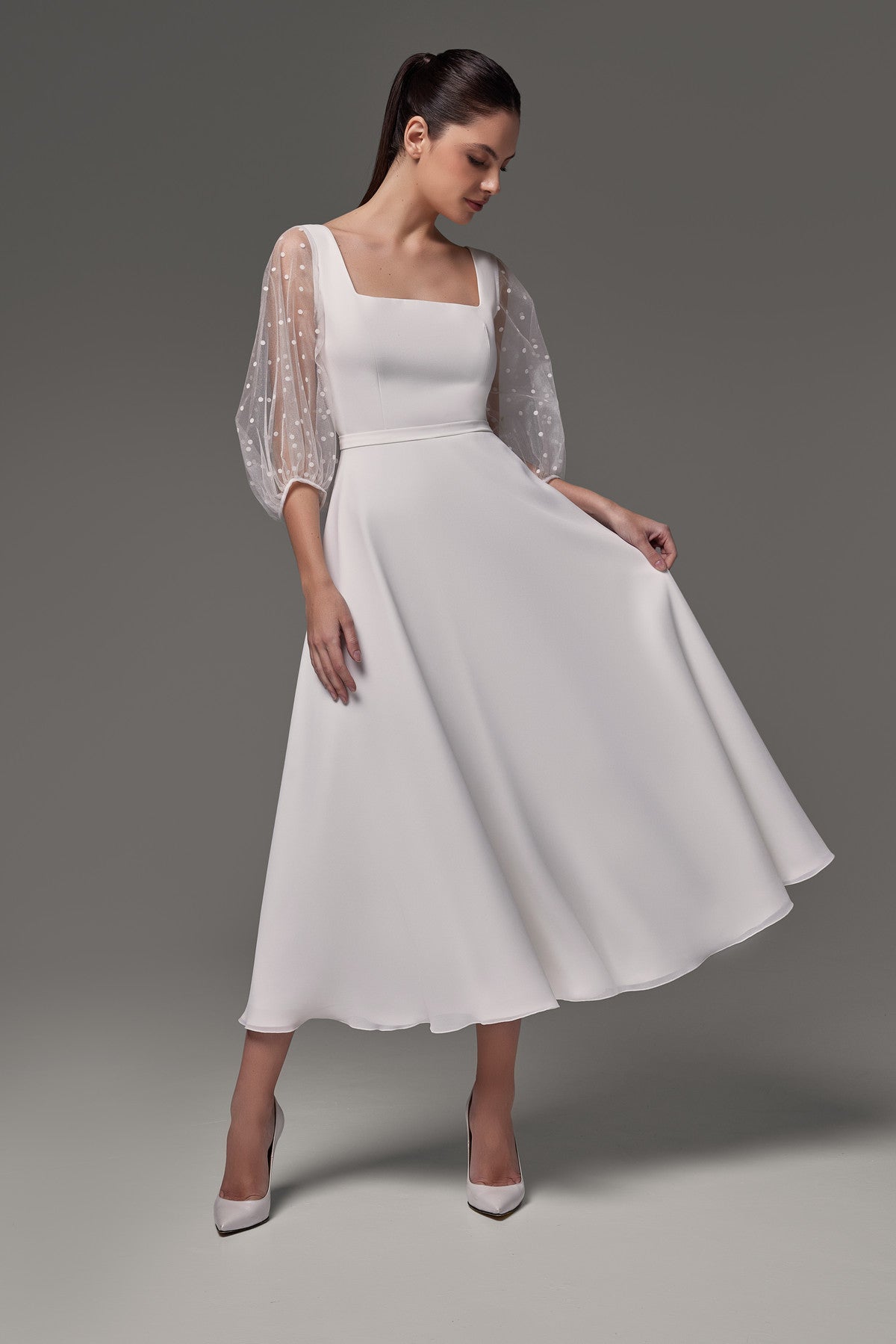 Skromna i elegancka sukienka Edison o długości midi idealnie nadaje się do wesela w retro klimatach. Jej smaczkiem są ozdobne rękawy z tiulu, natomiast reszta sukni wykonana jest z krepy elastycznej.