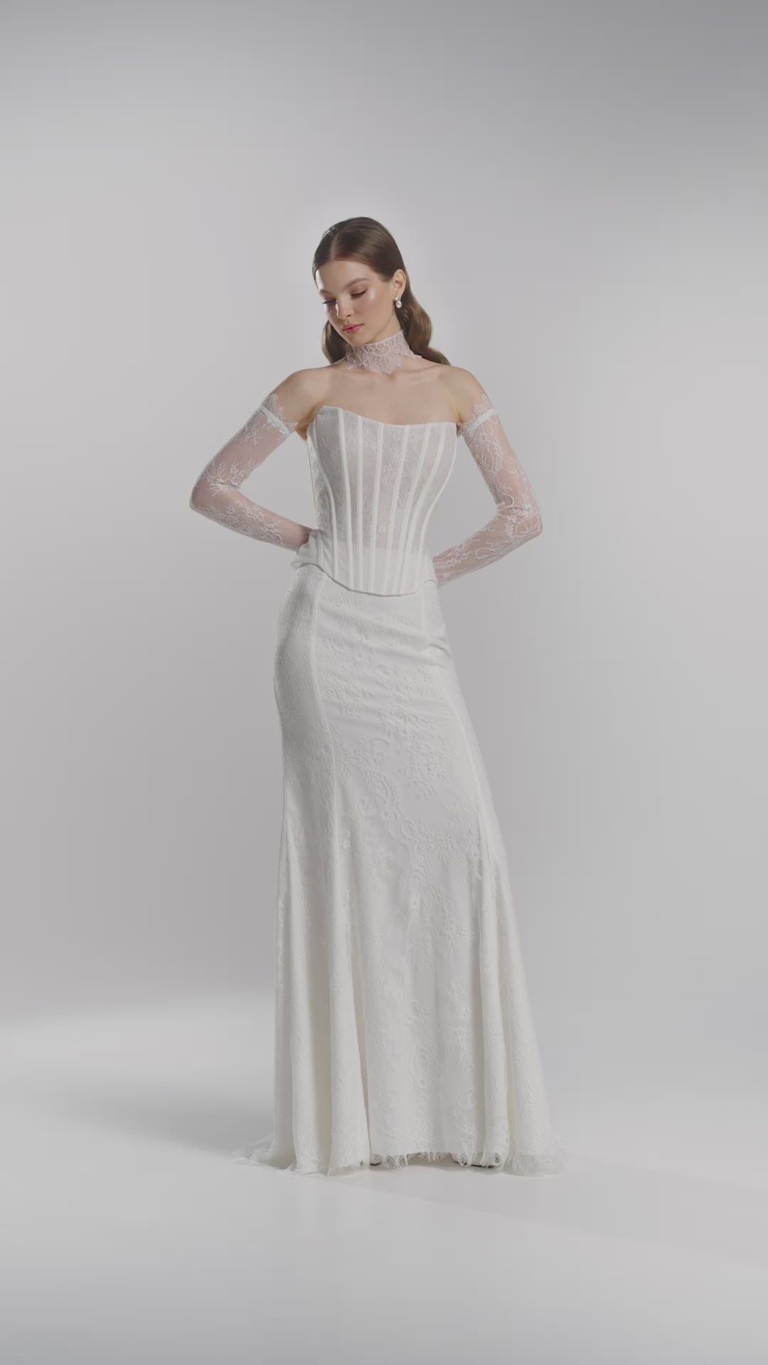 Koronkowy komplet ślubny ze spódnicą-syrenką — to niezwykle zmysłowa i elegancka kreacja, tworząca idealny balans między klasyką a szykiem. Dopasowana spódnica subtelnie podkreśla sylwetkę, a jej rozszerzany dół ze spektakularnym trenem dodaję dramatyzmu. Gorsetowa góra z wiązaniem z tyłu mimo dopasowania zapewnia swobodę ruchów. Koronkowe odpinane rękawy przydają się w kościele oraz w chłodniejsze dni, pasując zarówno do klasycznych, jak i bardziej zmysłowych czy rustykalnych ceremonii.