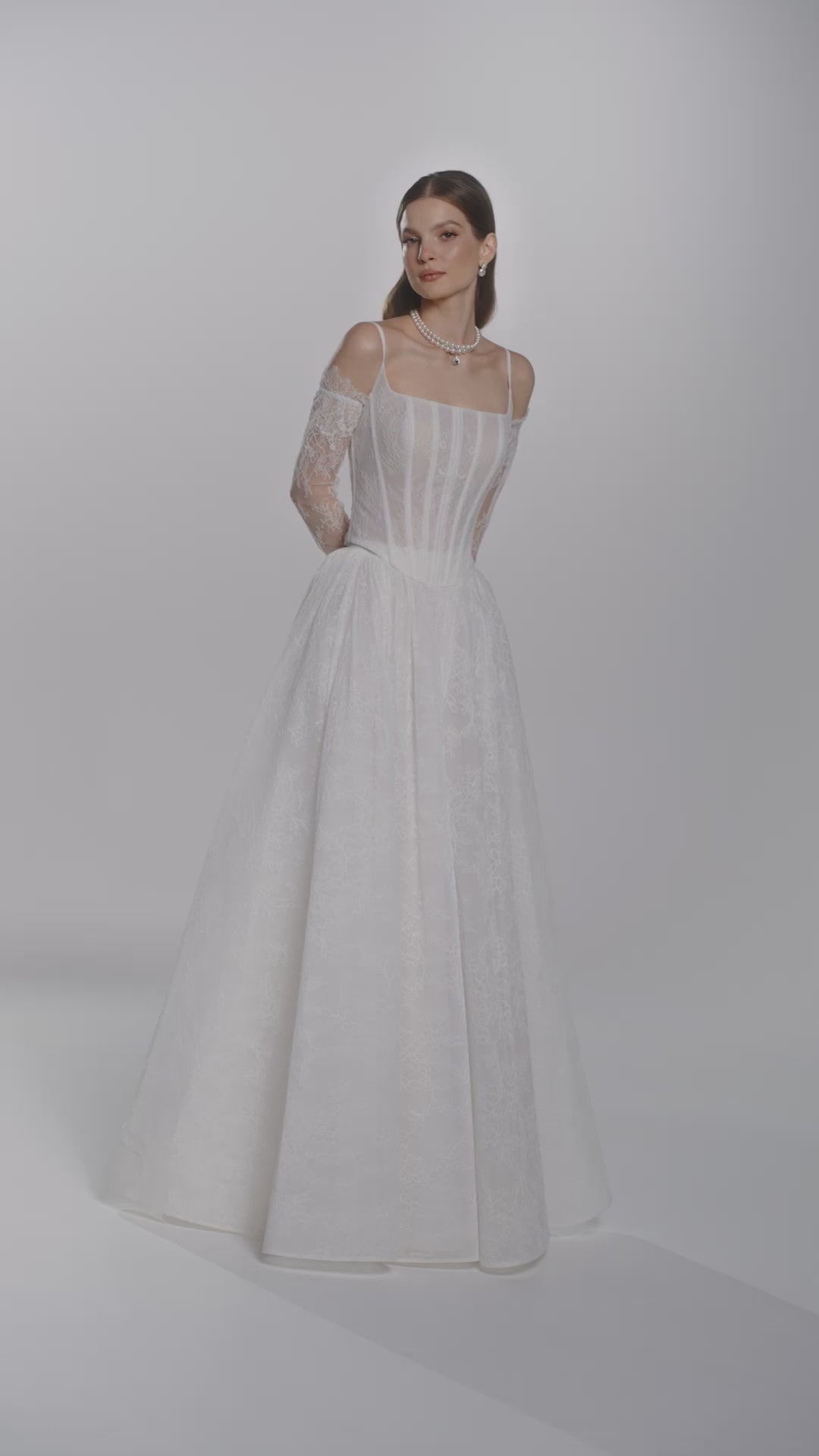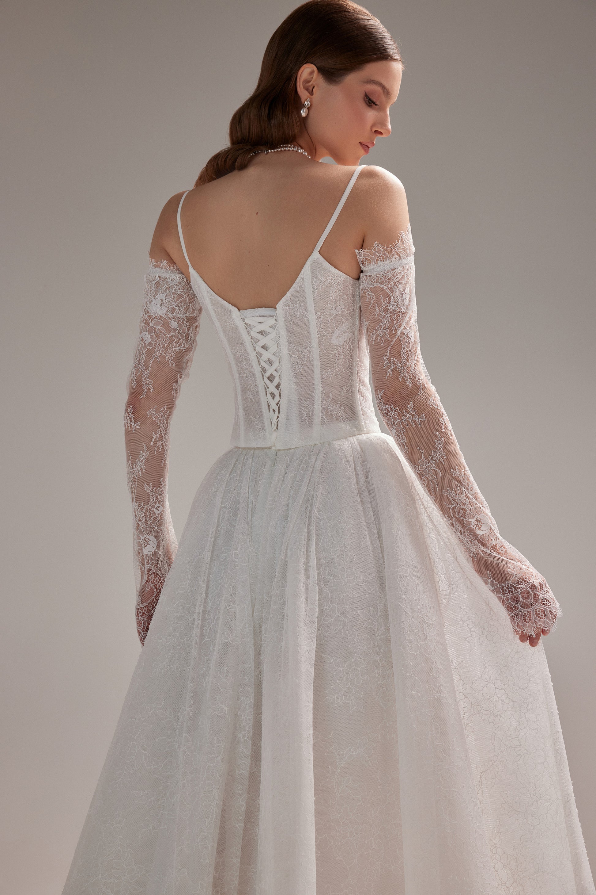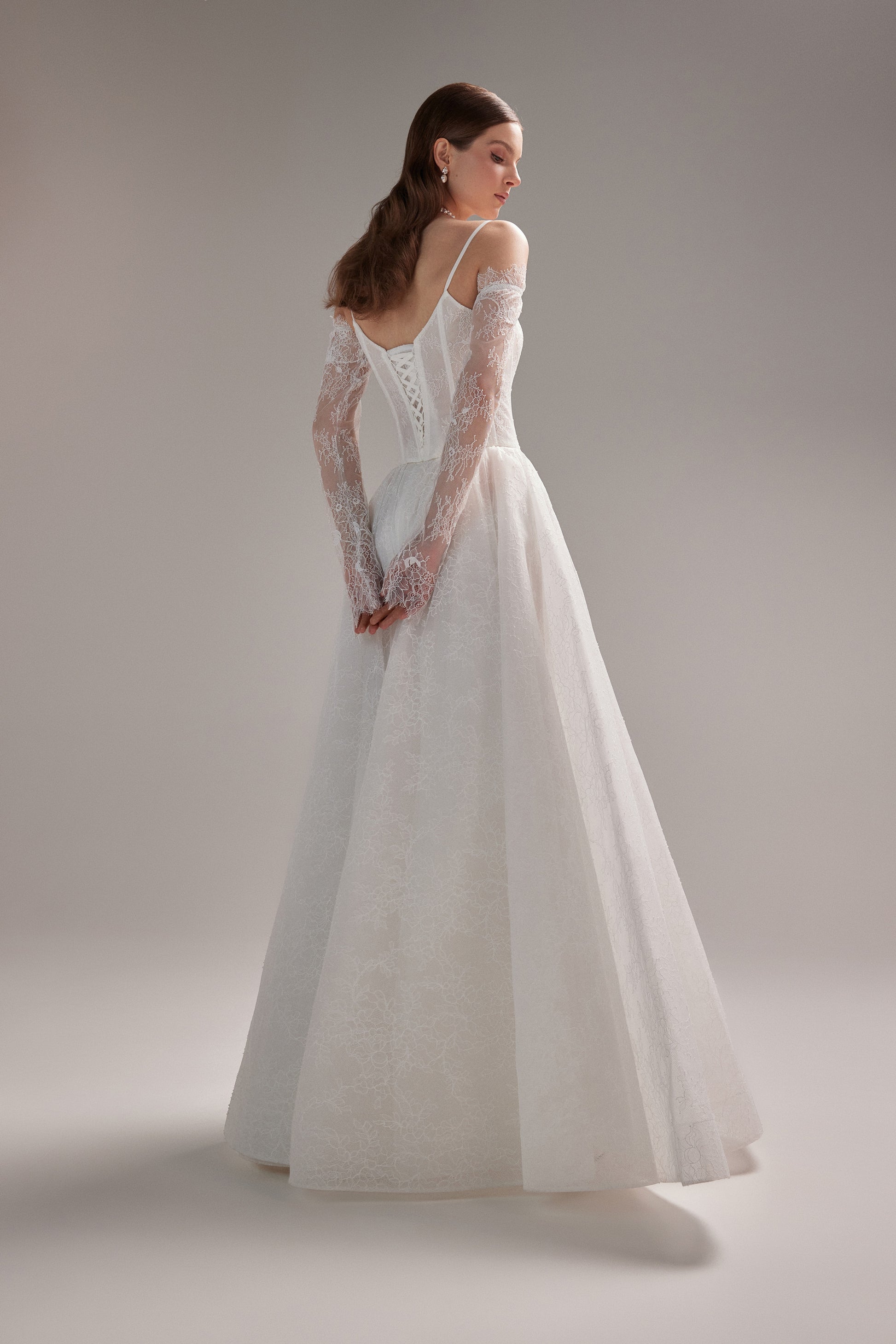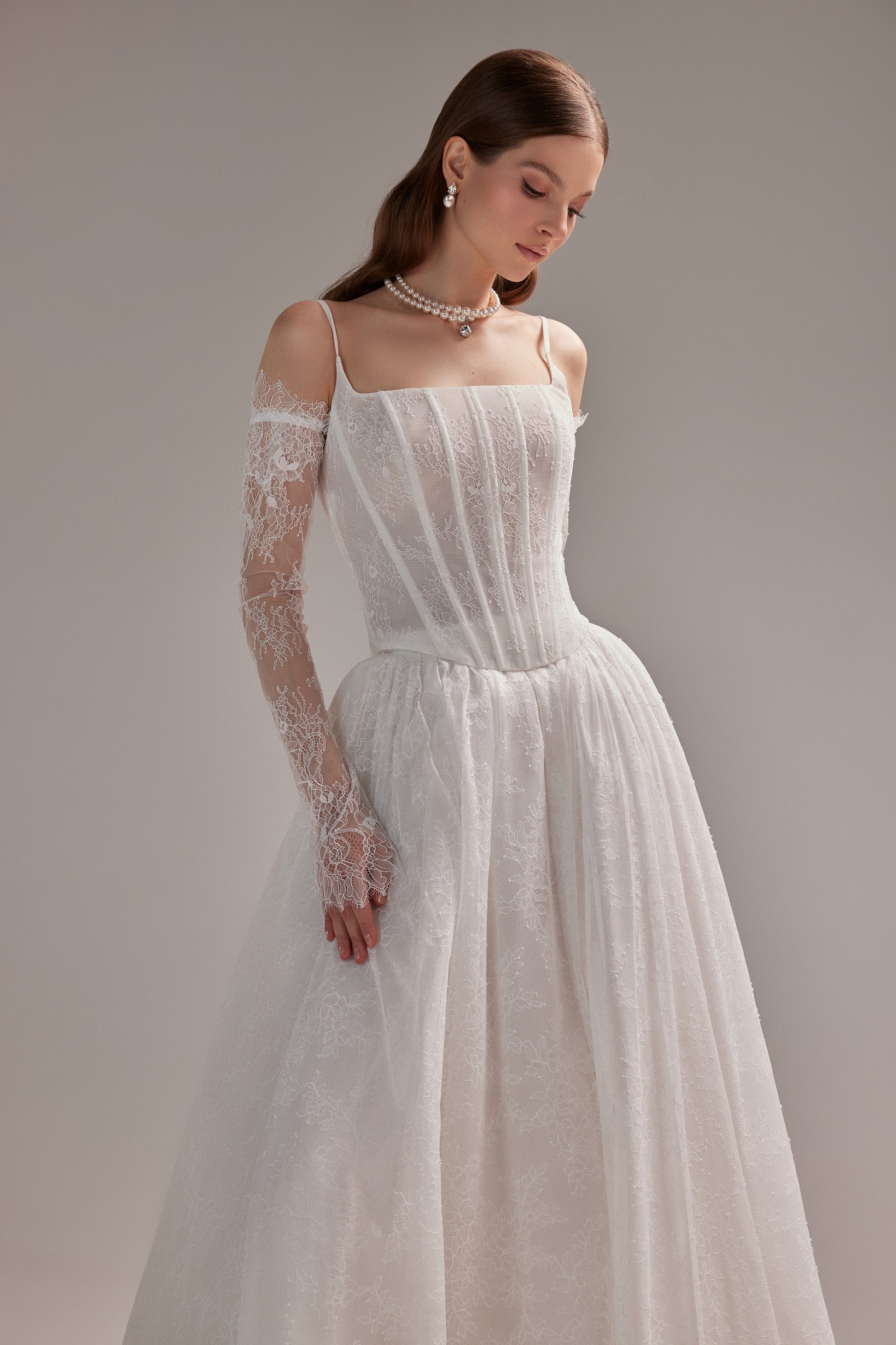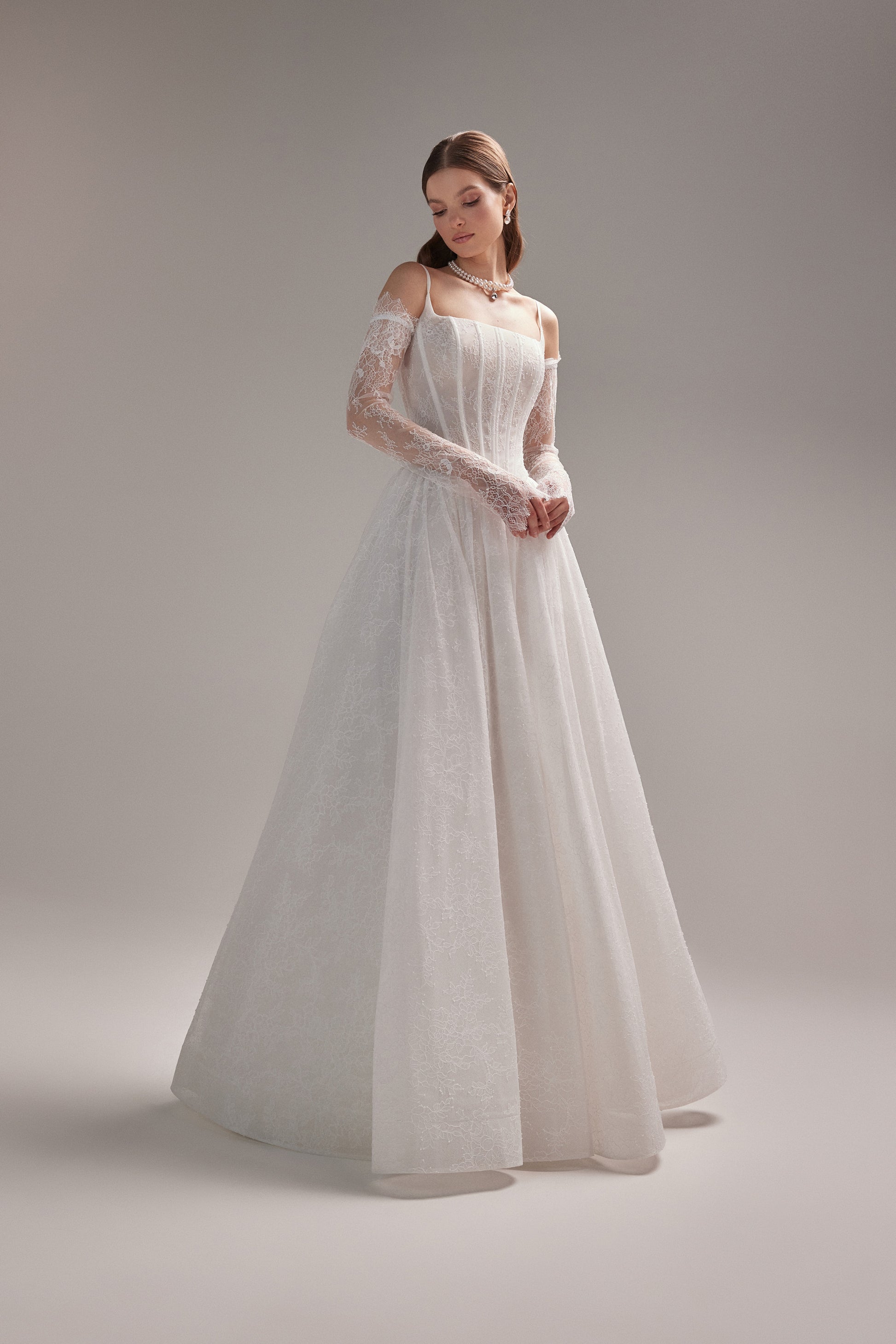 Ta suknia łączy w sobie ponadczasową elegancję kroju w literę "A" i delikatność koronki Chantelle. Klasyczna usztywniona góra z kwadratowym dekoltem ozdobiona subtelnymi, cienkimi ramiączkami, które dodają lekkości i nowoczesnego charakteru, jednocześnie zapewniając wsparcie dla gorsetu.Koronkowe rękawki dodają eterycznego, romantycznego charakteru. Dzięki zastosowaniu lekkich materiałów i przemyślanemu krojowi suknia Rakiel oferuje dużą swobodę ruchów. Idealny wybór Panny Młodej ceniącej sobie subtelny urok i wyrafinowanie.