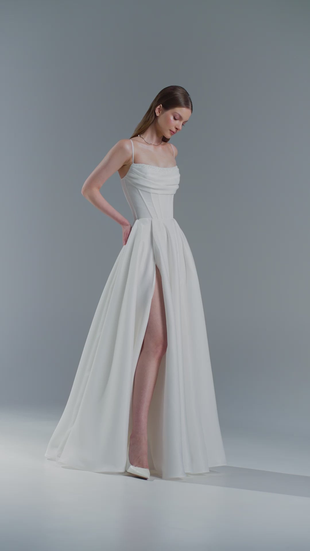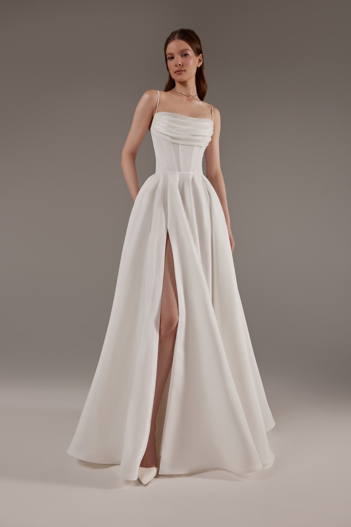 Nowoczesna elegancka suknia ślubna ze strukturalny gorsetem z drapowaniem, łącząca architektoniczną precyzję z romantyczną miękkością.Wykonana z luksusowego materiału mikado sukienka podkreśla sylwetkę, zapewniając jednocześnie komfort, a cienkie paski spaghetti dodają delikatnego akcentu. Dopasowana góra płynnie przechodzi w zwiewną spódnicę w kształcie litery A z rozcięciem zapewniającym łatwy ruch i odrobinę zmysłowości. Suknia Rihanna Idealna na wesela w ciepłą pogodę ceremonie plenerowe, rozkoszne przyjęcia lub nawet do ołtarzu, zapewniając że wyglądasz oszałamiająco i czujesz się komfortowo przez cały dzień.