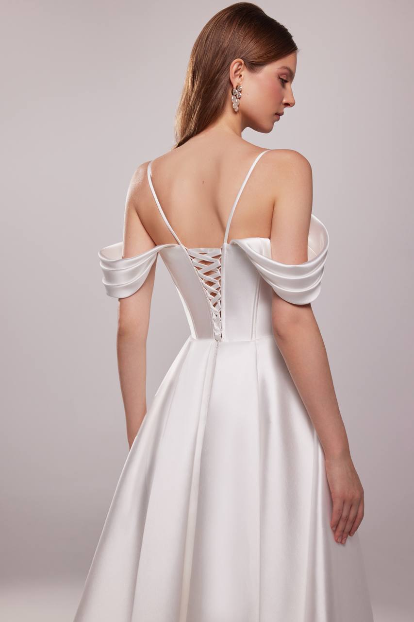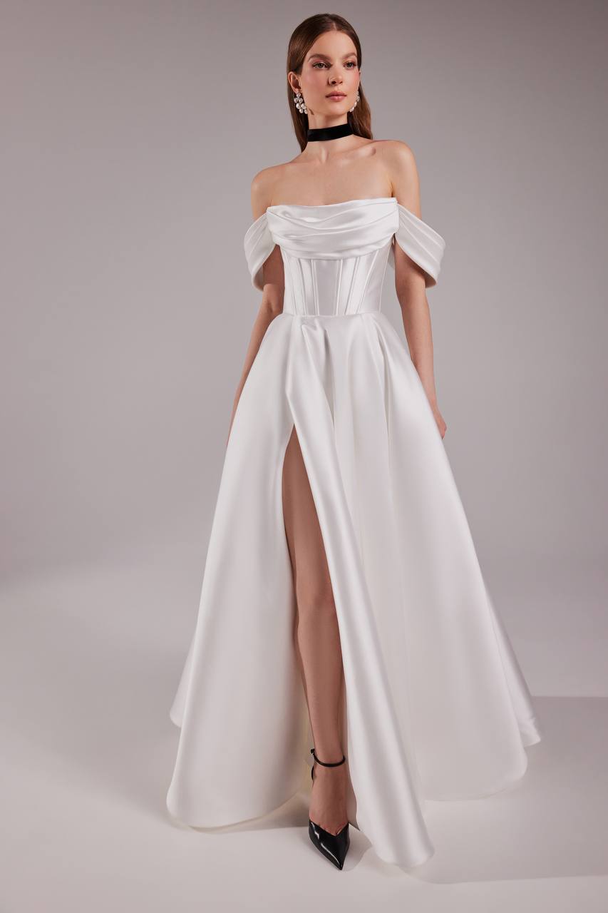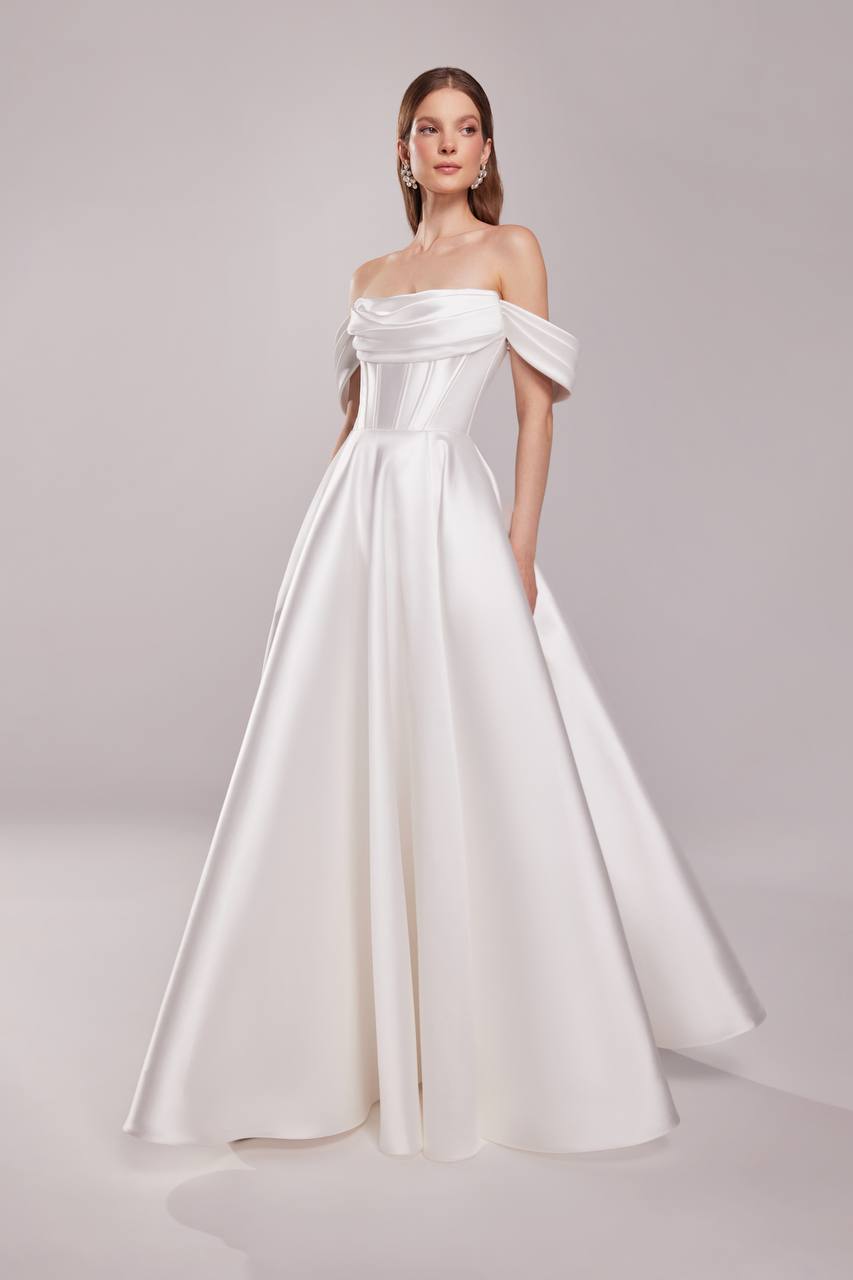 Nowoczesna elegancka suknia ślubna ze strukturalnym gorsetem z drapowaniem, łącząca architektoniczną precyzję z romantyczną miękkością. Wykonana z luksusowego materiału mikado sukienka podkreśla sylwetkę, zapewniając jednocześnie komfort. Odpinane hiszpańskie ramiączka dają możliwość szybkiej zmiany kreacji w ciągu imprezy, a cienkie paski spaghetti dodają delikatnego akcentu.