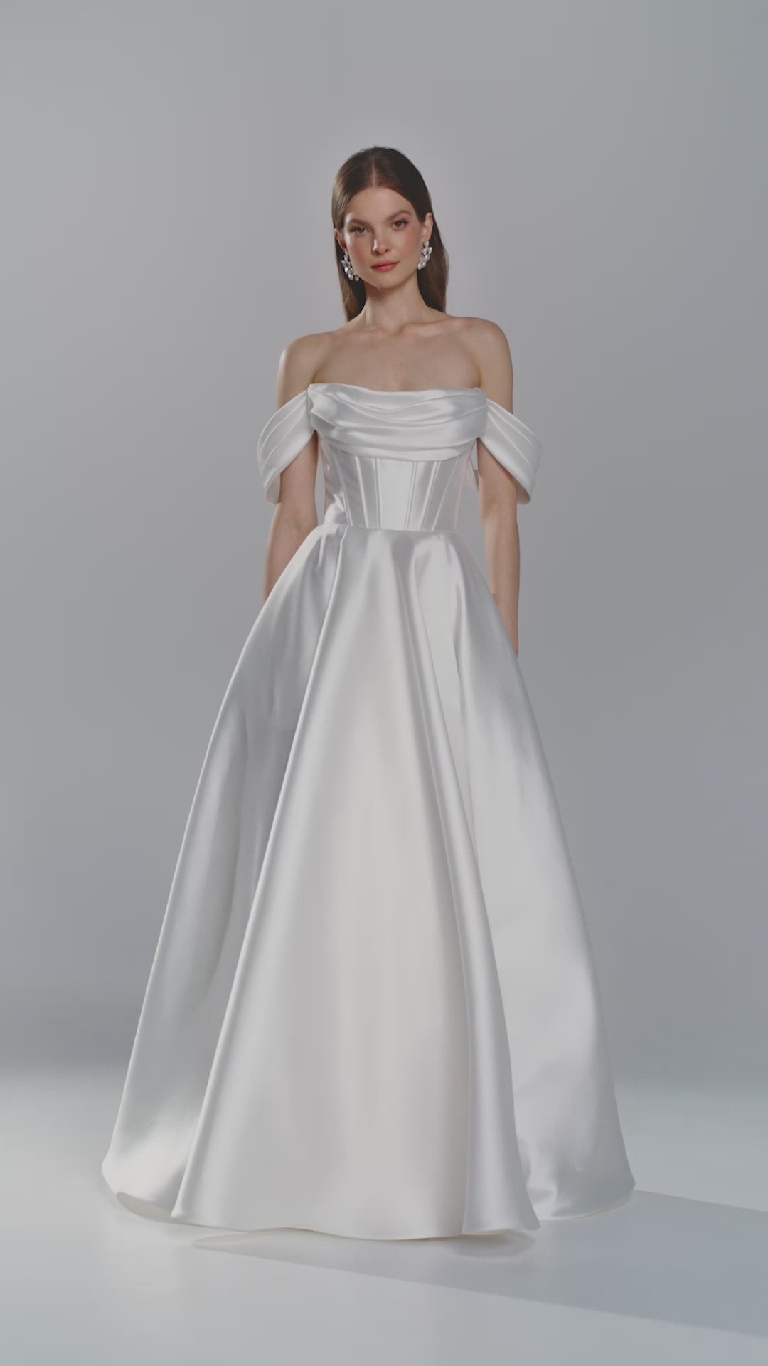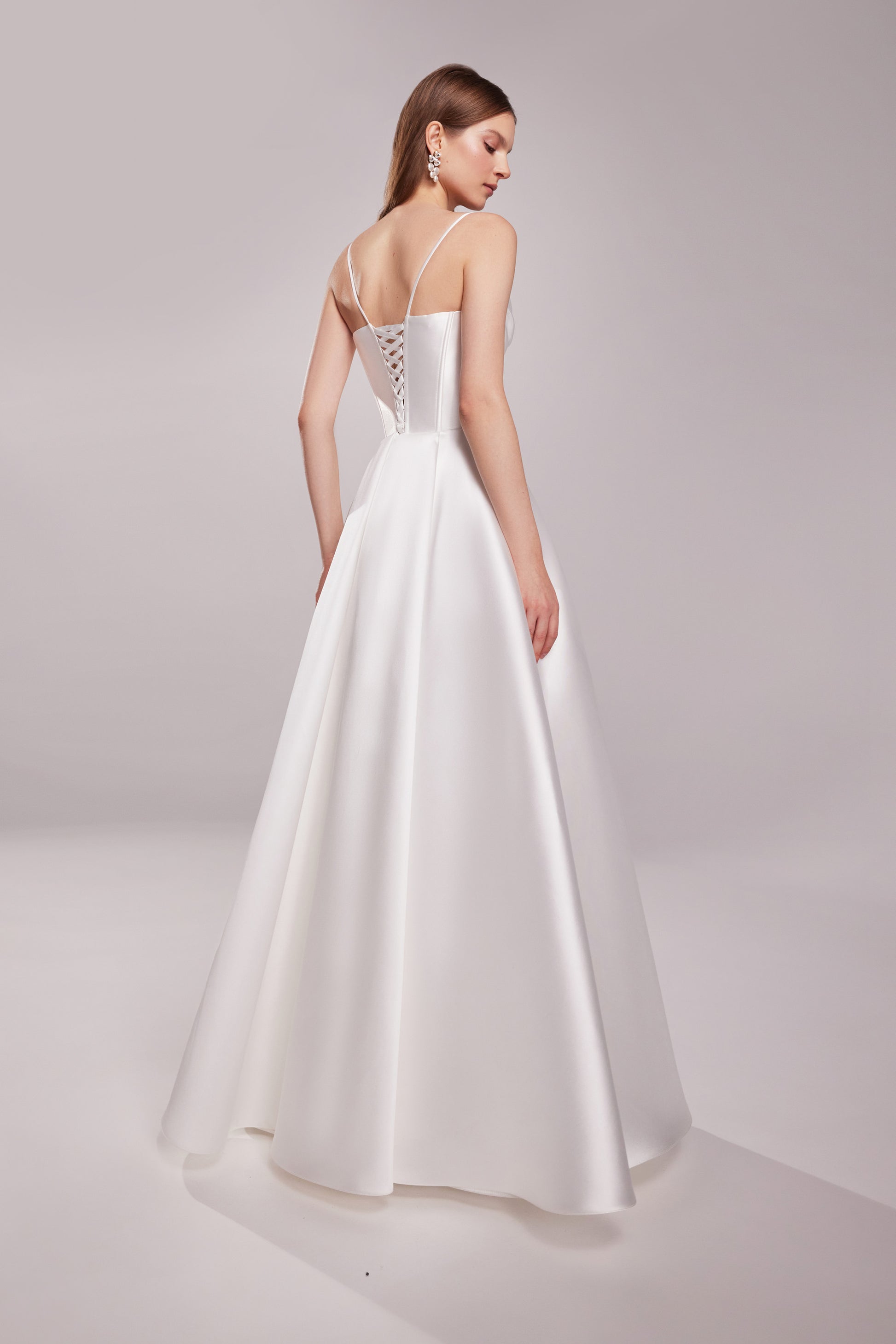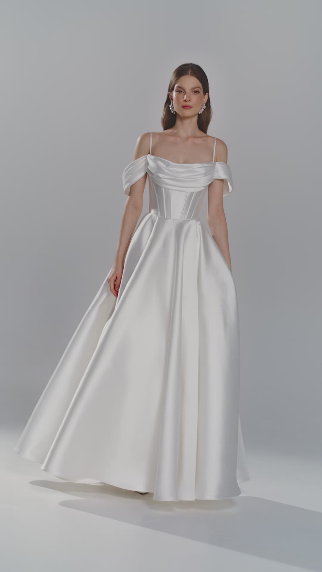 Nowoczesna elegancka suknia ślubna ze strukturalnym gorsetem z drapowaniem, łącząca architektoniczną precyzję z romantyczną miękkością. Wykonana z luksusowego materiału mikado sukienka podkreśla sylwetkę, zapewniając jednocześnie komfort. Odpinane hiszpańskie ramiączka dają możliwość szybkiej zmiany kreacji w ciągu imprezy, a cienkie paski spaghetti dodają delikatnego akcentu.