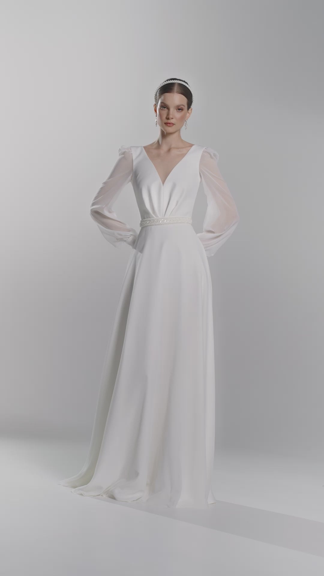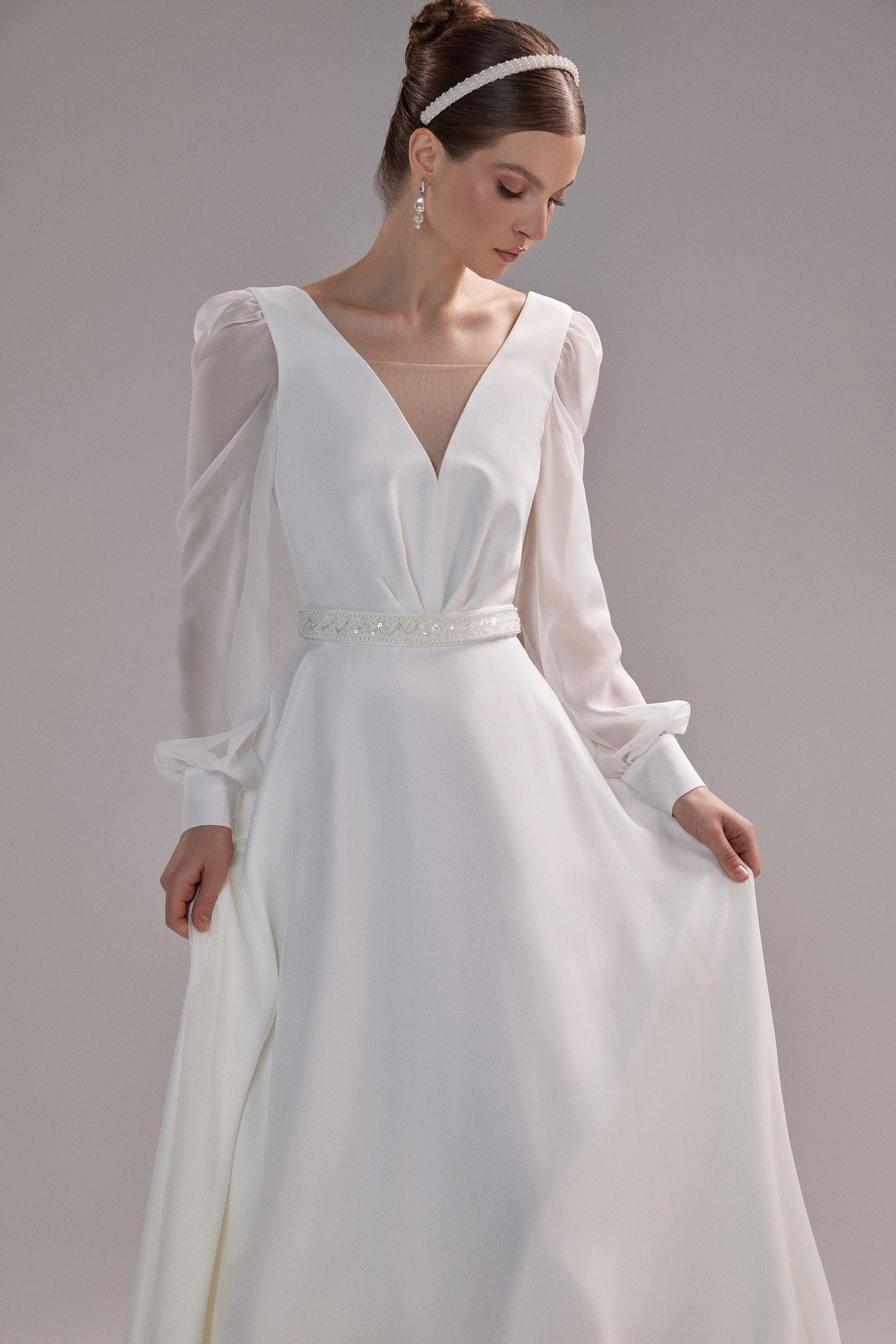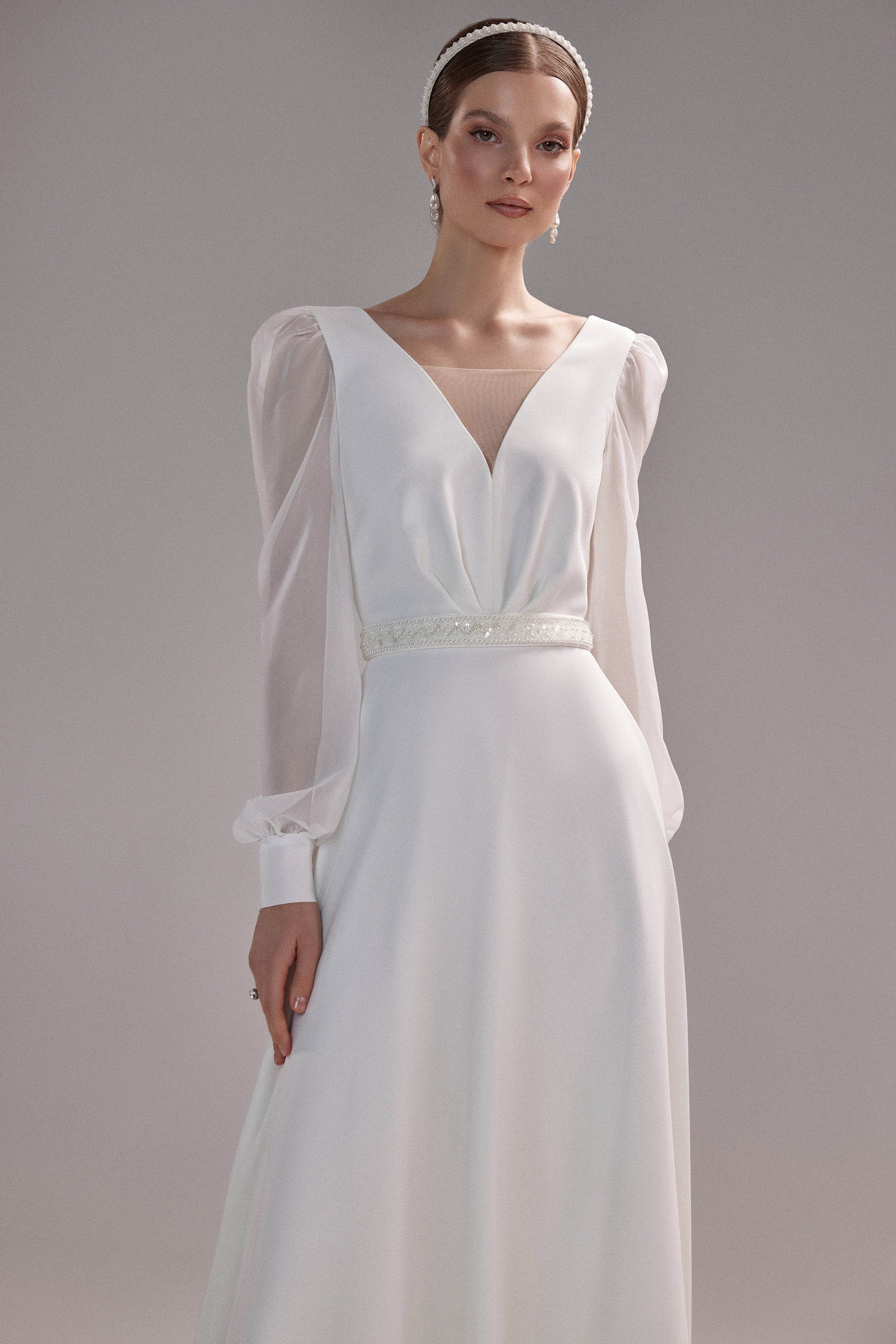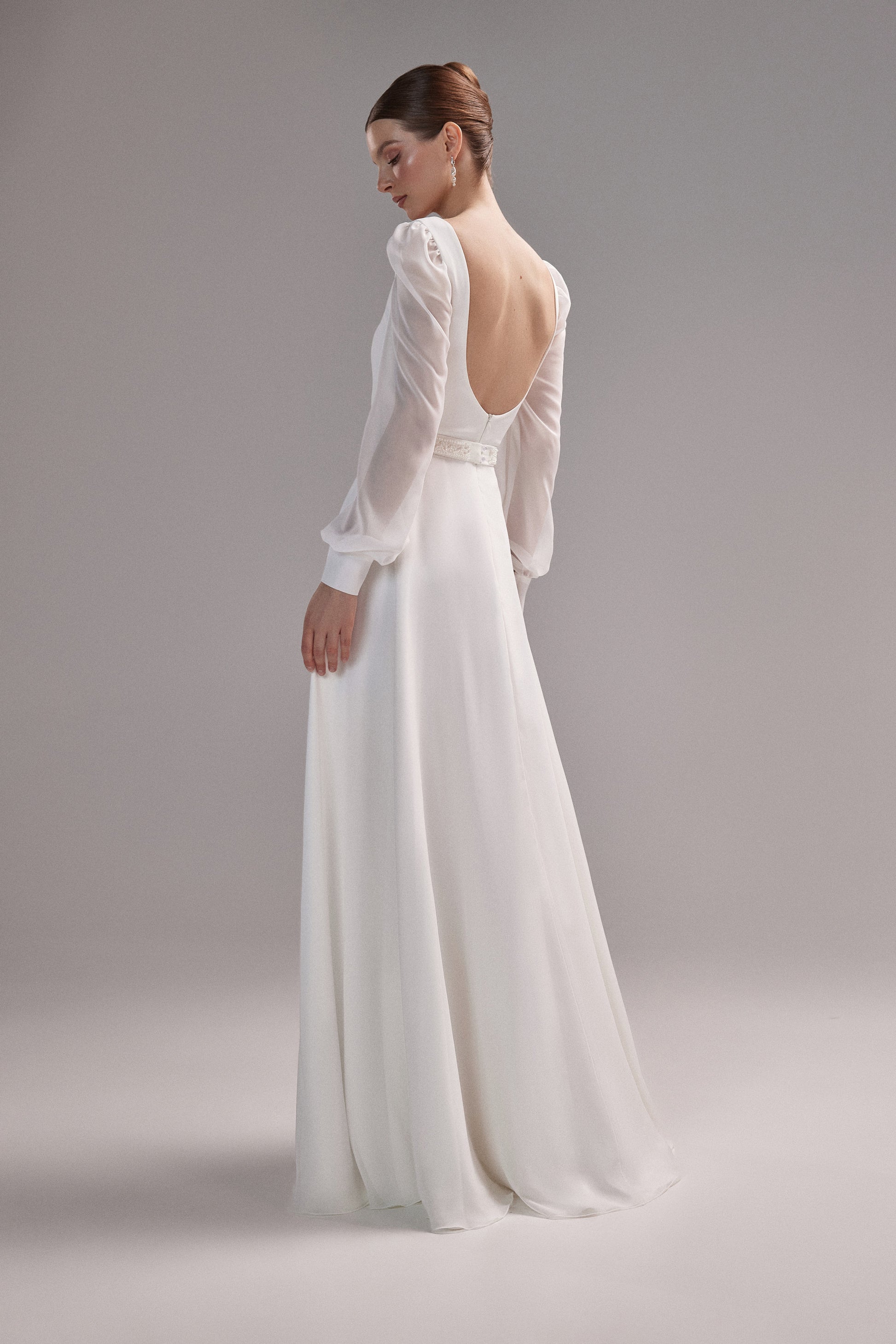 Skromna suknia ślubna z krepy włoskiej z dekoltem w kształcie "V", odkrytymi plecami i długimi rękawami z szyfonu, zapinanymi na mankietach. Pasek haftowany koralikami dodaje delikatnego blasku.