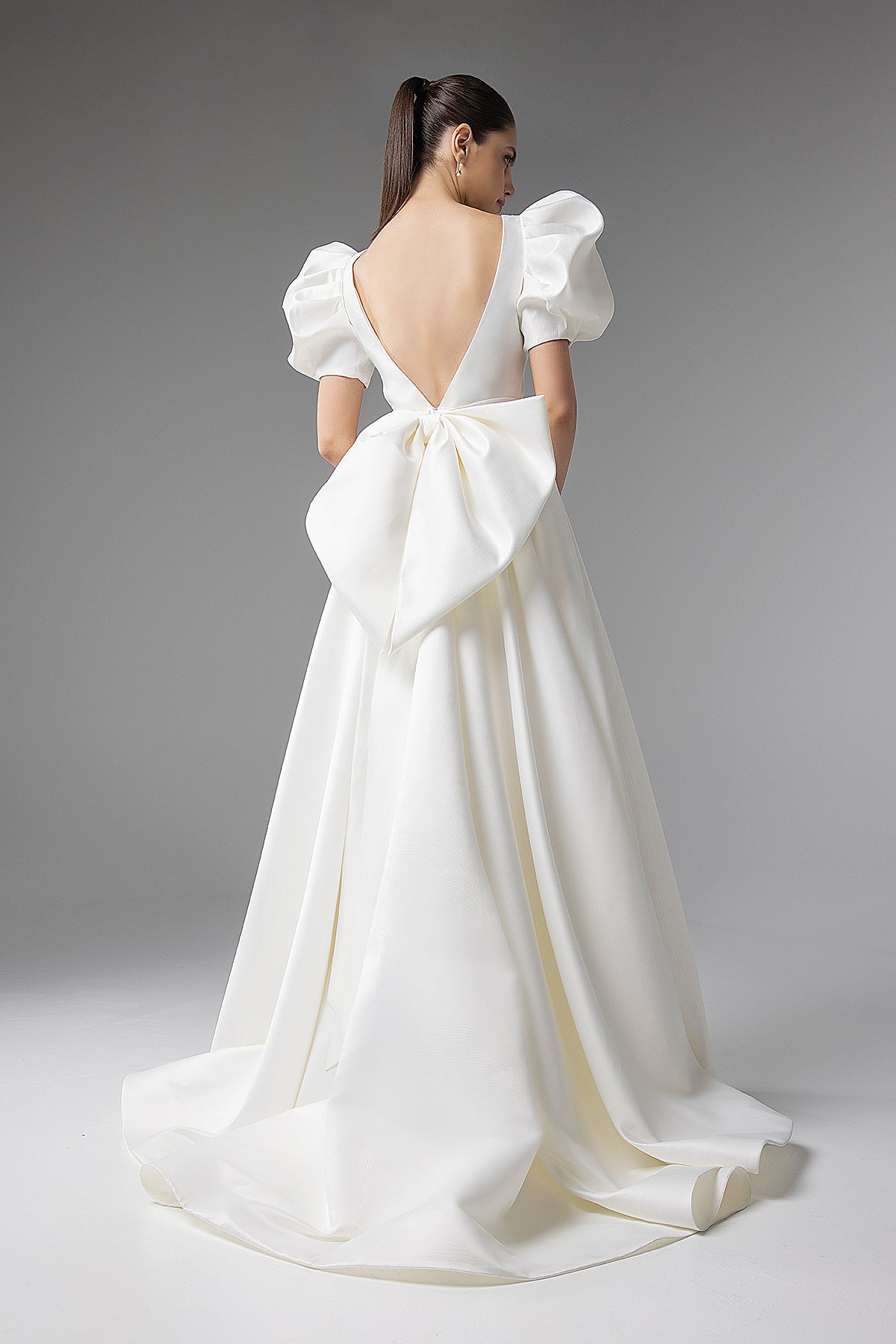 Dlaczego nie urozmaicić swój ślubny look suknią 2w1? Ta suknia jest idealn dla Panny Młodej, która chce zmienić wygląd w najważniejszy dzień. Dzięki temu stylowi 2w1 możesz łatwo przejść od ceremonii do uroczystości. Elegancka sukienka z kwadratowym dekoltem i krótkimi, bufiastymi rękawami, przekształca się z sukni balowej w mini imprezową sukienkę. Sukienka może być wykonana z delikatnego i luksusowego mikado lub teksturowanej satyny. Materiał pozwala suknie utrzymać jej fakturę, a jednocześnie jest miękki w dotyku